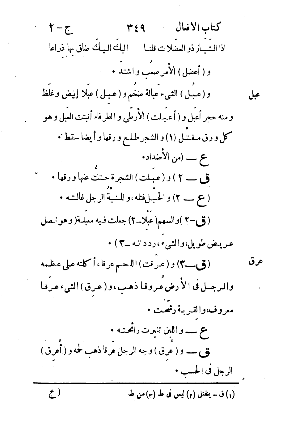 عبُل: و"عبُل" الشيء عَبالة ضخُم و"عبِل" عبَلا إبيض وغلَظ ومنه حجر أعبَل و"أعبَلت" الأرطَى والطرفاء أنبتت العبَل وهو كل ورد مفتَّل1 والشجر طلع ورقها وأيضاً سقط.