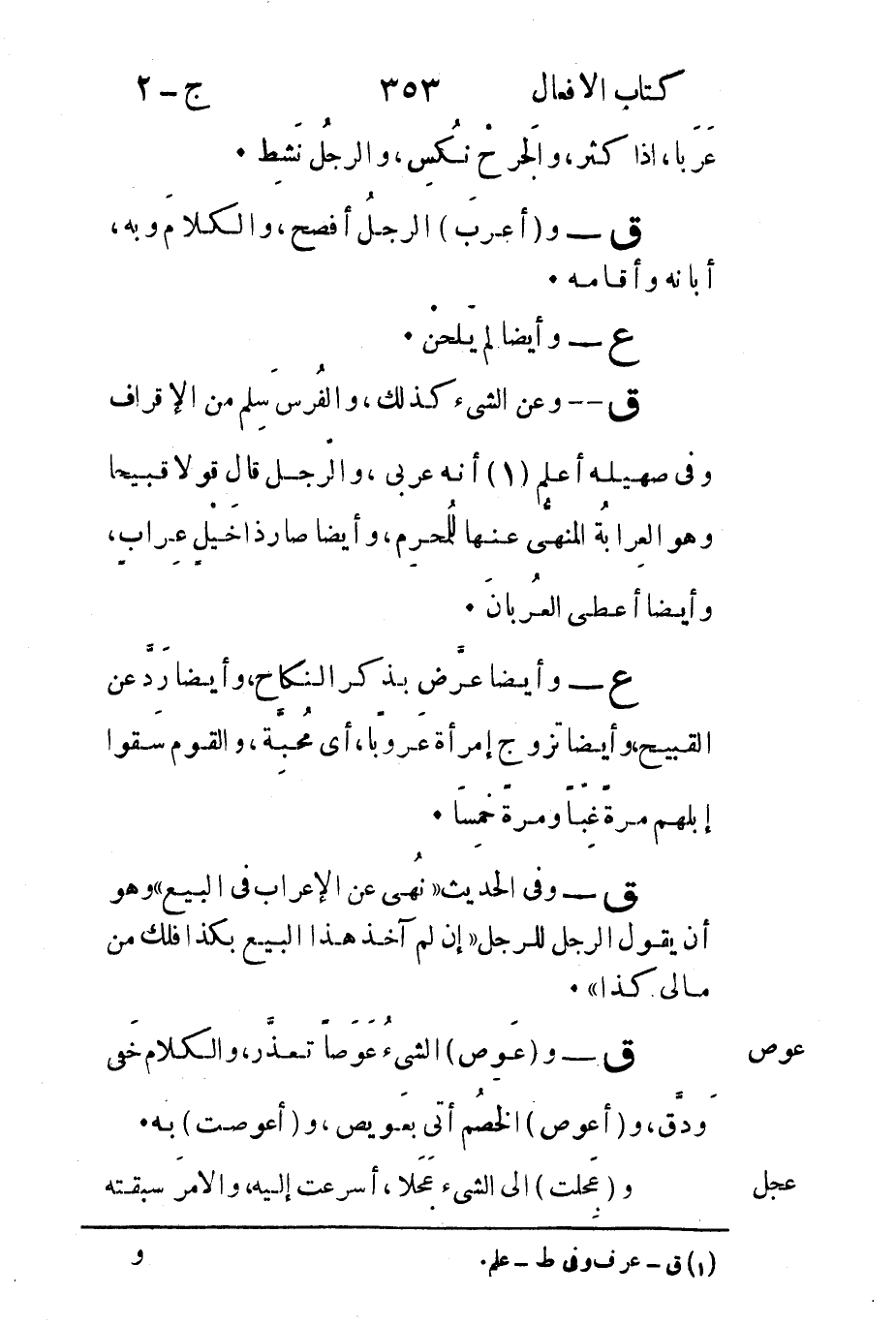 ق - وعن الشيء كذلك والفُرس سَلِم من الإقراف وفي صهيله أعلم1 أنه عربي والرّجل قال قولاً قبيحاً وهو العِرابةُ المنهىُّ عنها للمُحرِم وأيضاً صار ذا خَيْلٍ عِرابٍ وأيضاً أعطى العُربانَ.
