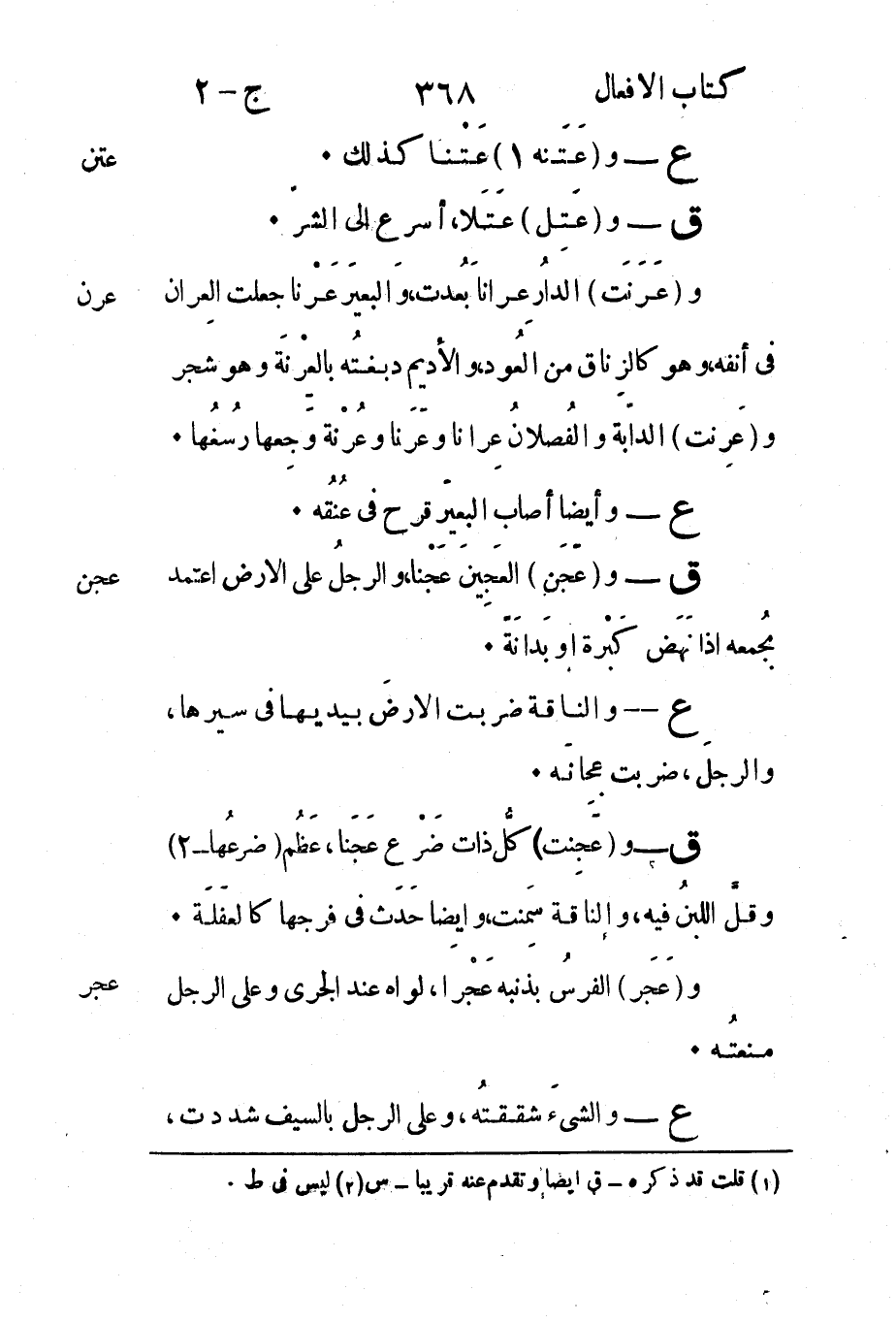 عَرَنَ: و"عَرَنَتَ" الدارُ عِراناَ بُعدت والبعيرَ عَرْنا جعلت العِران في أنفه وهو الكزِناق من العُود والأديم دبغتُه بالعِرْنةَ وهو شجر و"عَرِنت" الداّبة والفُصلانُ عِرانا وعَرَفا وعُرْنة وَجِعها رُسغُها.
