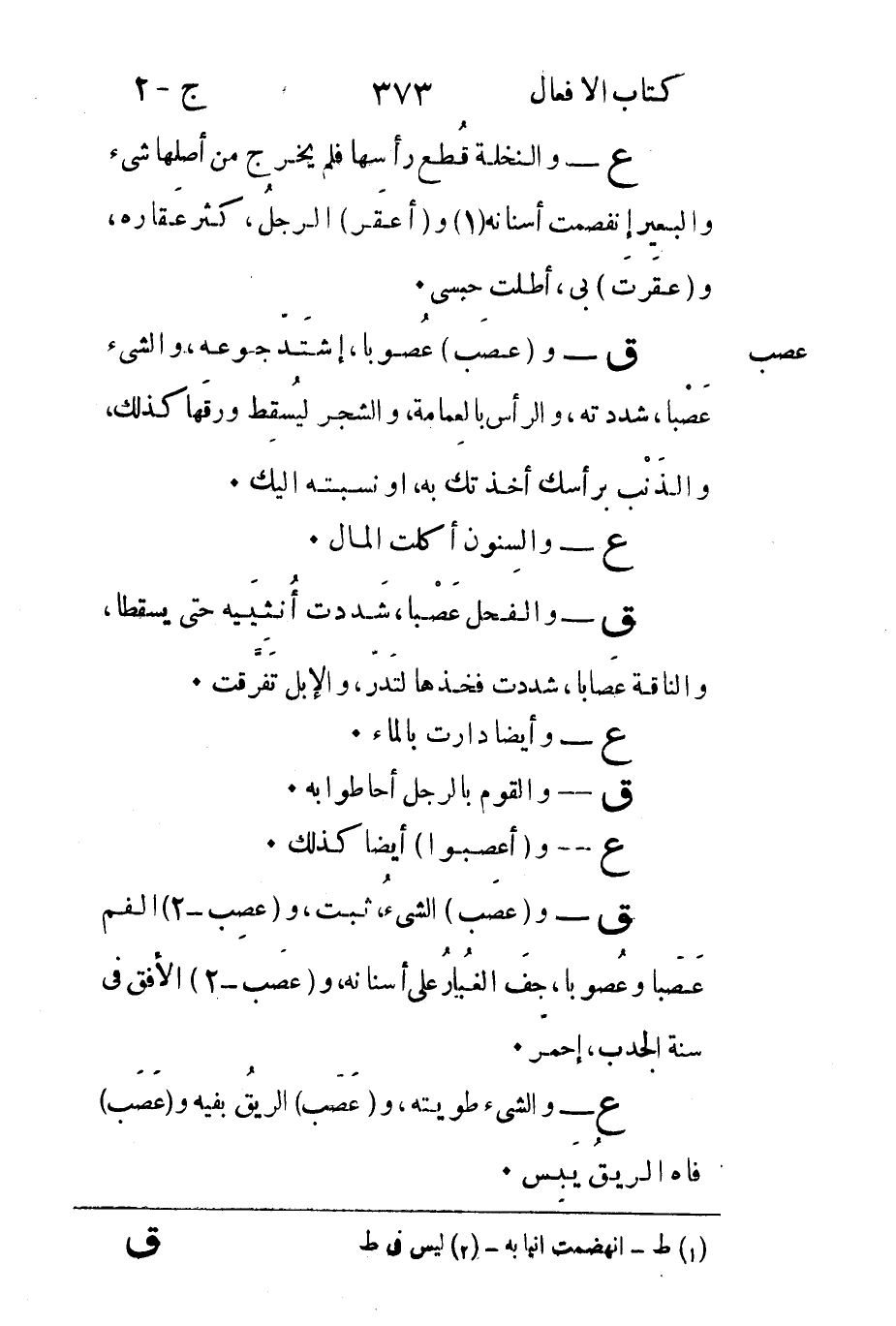 ق - و"عصَب" عُصوبا إشتَدّ جوعه والشيء عَصْبا شددته والرأس بالعِمامة والشجر ليُسقِط ورقَها كذلك والذَنْب برأسك أخذتك به أو نسبته إليك.