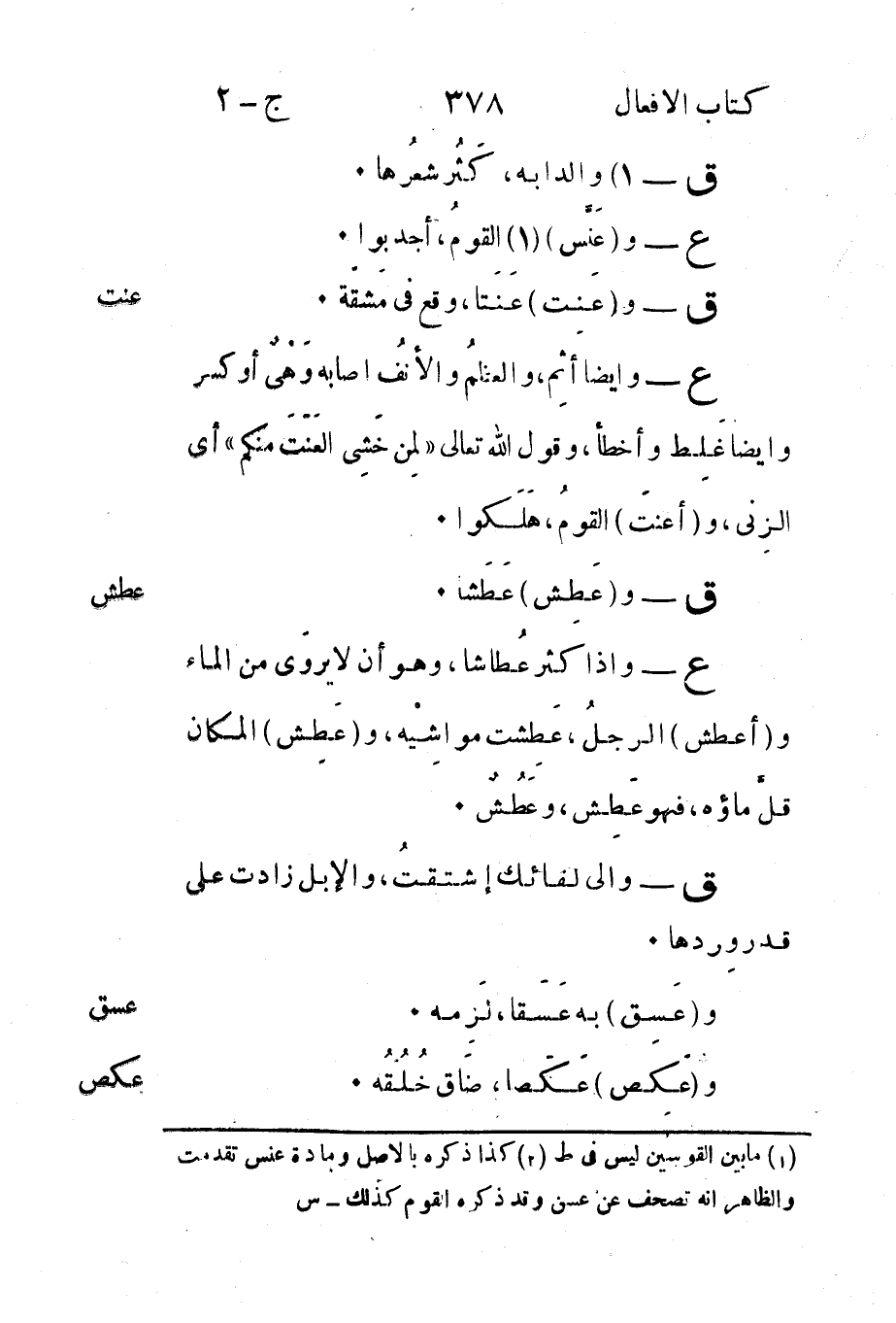 ع - وإذا كثر عُطاشا وهو أن لا يروَى من الماء و"أعطش" الرجلُ عَطِشت مواشِيْه "وعَطِش" المكان قلَّ ماؤه فهو عَطِش وعَطُشٌ.