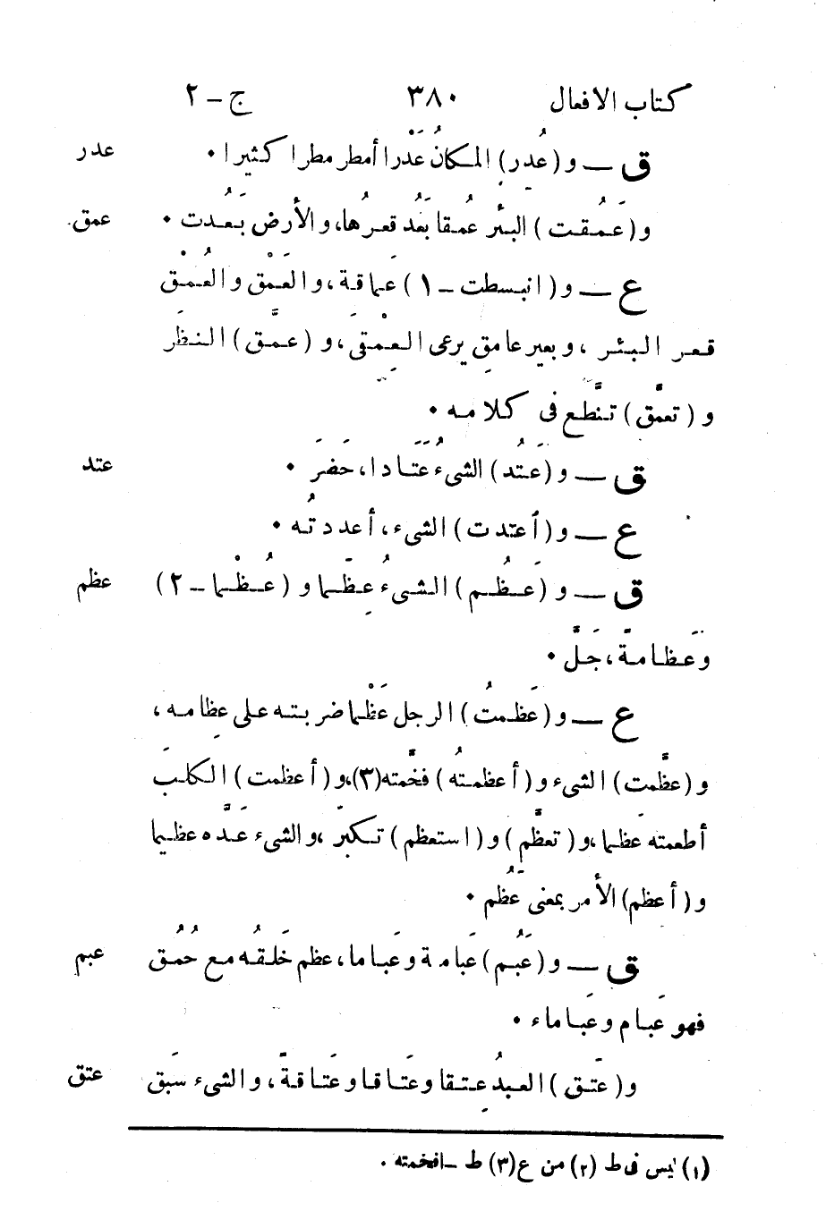 ع - و"انبسطت"1 عَماقة والعَمْق والعُمْق قعر البئر وبعير عامِق يرعى العِمْقَى و"عمَّق" النظَر و"تعمَّق" تنَّطع في كلامه.