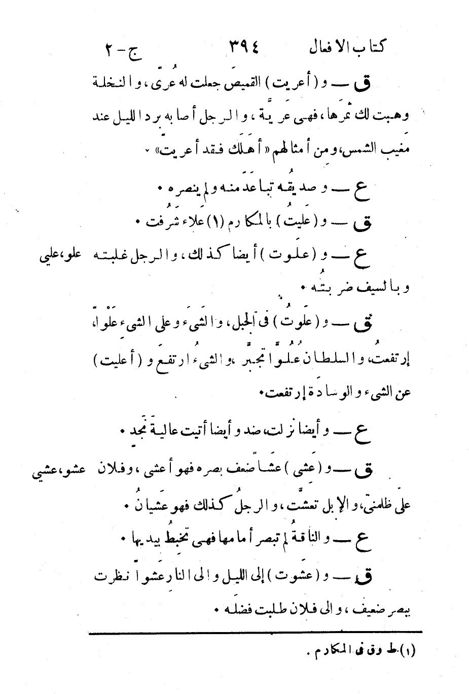 ق - واعريت القميصَ عُرىً والنخلة وهبت لك ثمرَها عَريَّة والرجل أصابه برد اليل عند مَغيب الشمس ومن امثالهم اهَلَك فقد اعريتً.