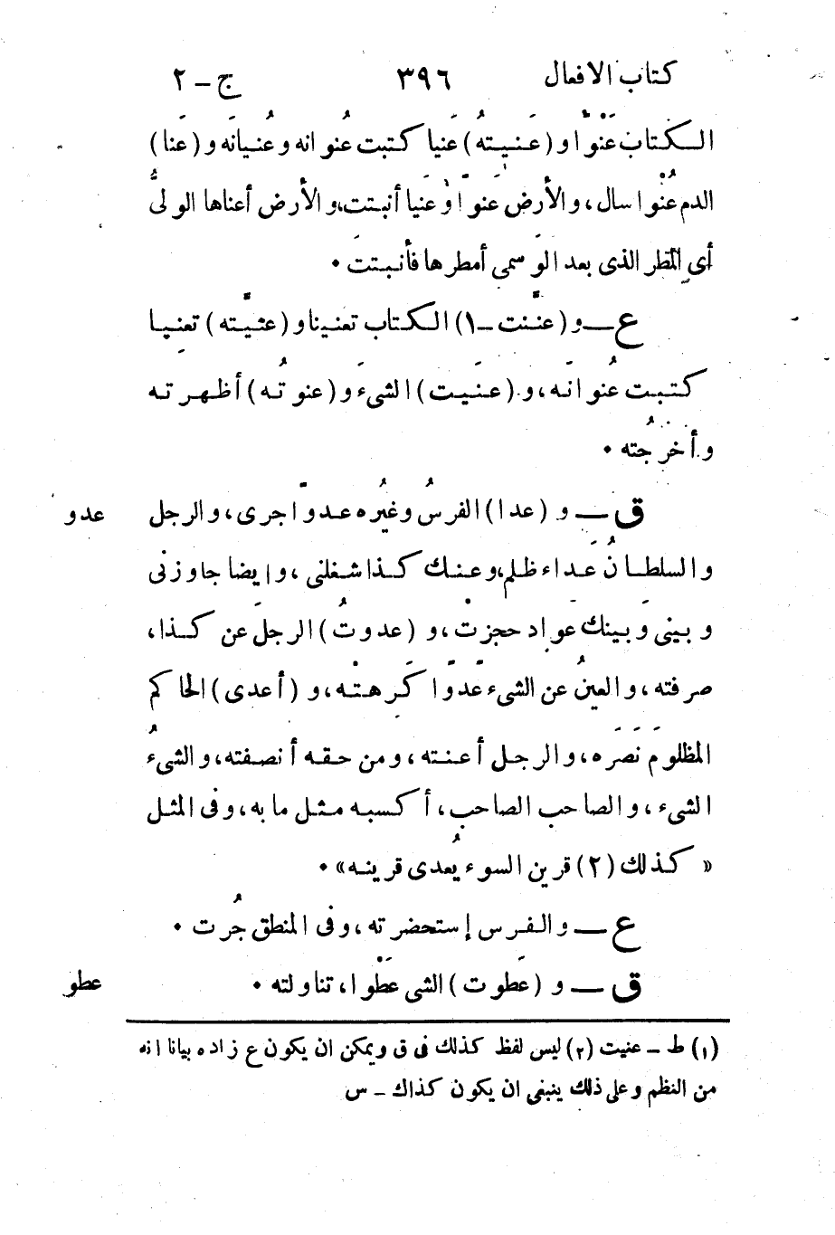عدو: ق - وعدا الفرشُ وغيرُه عدواً اجرى وتالرجل والسلطانُ عَداء ظلم وعنك كذا شغلنى وأيضا جاوزنى وبينىَ وبينكَ عواد حجزتْ وعدوتُ الرجلَ عن كذا صؤفته والعينُ عن الشيء عًوًا اكرعتْه وأعدى الحاكم المظلومَ نَصَره والرجل اعنته ومن حقه انصفته والشيءُ الشيء والصاحب الصاحب أكسبه مثل ما به وفي المثل.