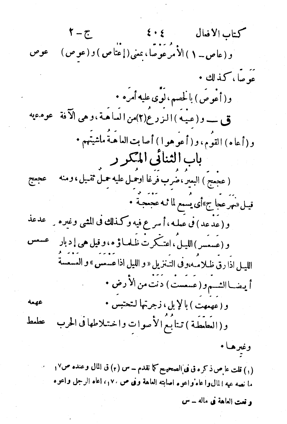 2 ق المال وعنده ص 7 ما نصه عيه المال وأعاه وأعوه أصابته العاهة وفي ص 7 أعاه الرجل وأعوه وقعت العاهة في ماله - س.