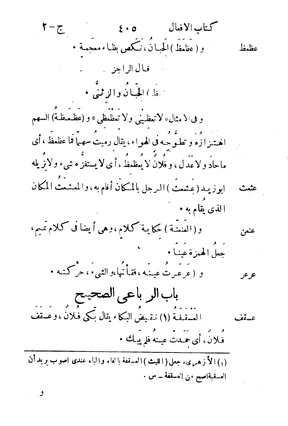 1 الأزهري جعل "الليث" العسقفة بالفاء والباء عندي أصوب يريد أن العسقبة أصبح من العسقفة - س.