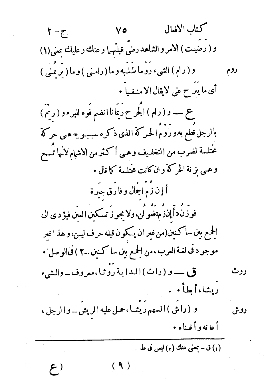 ع - و"رام" الجرح ريمانا انضم فوه للبرء و"ريم" بالرجل قطع به وروم الحركة الذي ذكره سيبويه هي حركة مختلسة لضرب من التخفيف وهي أكثر من الاشمام لأنها تسمع وهي بزنة الحركة وإن كانت مختلسة كما قال.