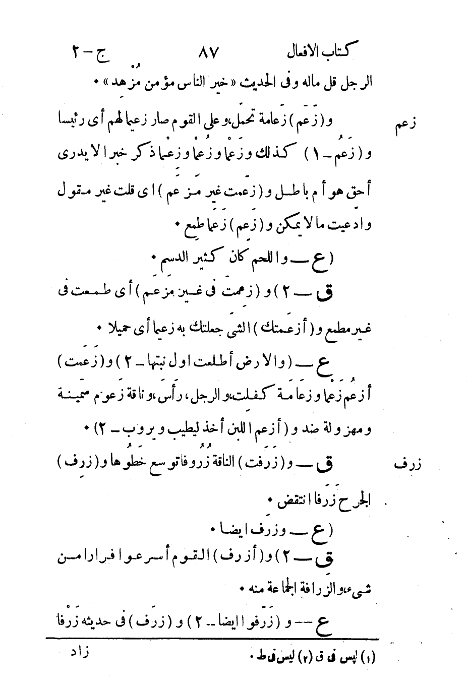 ع - "والأرض أطلعت أول نبتها"2 و"زَعَمت" أزعُم زَعْما وزَعَامَة كفِلت والرجل رَأسَ وناقة وزَعوم سَمينة ومهزولة ضد و"أزعم اللبن أخذ ليطيب ويروب2".