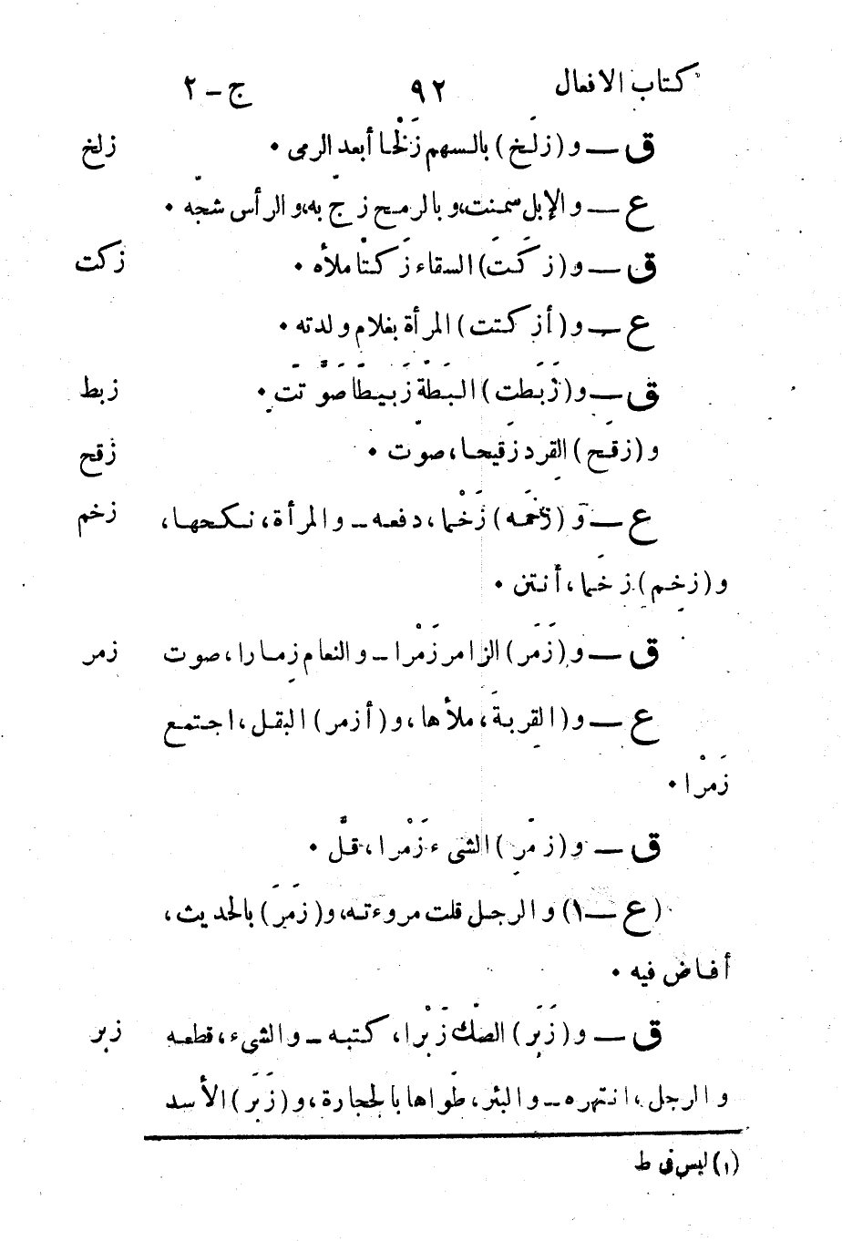 ع - و"القِربةَ ملأها و"أزمر" البقل اجتمع زَمْرا.