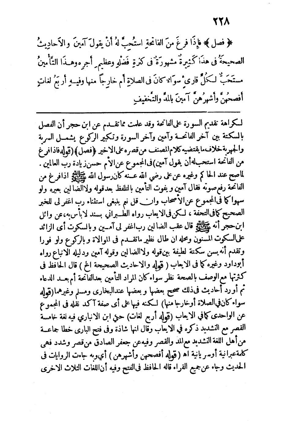 قوله: (فإِذَا فرغَ مِنَ الفاتحةِ استُحِبَّ لَهُ أَنْ يقولَ آمينَ) في المجموع عن الأم حسن زيادة رب العالمين. لما صح عند الحاكم وغيره عن علي رضي الله عنه كان رسول الله - صلى الله عليه وسلم - إذا فرغ من الفاتحة رفع صوته فقال آمين ويفوت التأمين بالتلفظ بعد قوله ولا الضالين بغيره ولو سهوًا كما في المجموع عن الأصحاب وإن قل نعم ينبغي استثناء رب اغفر لي للخبر الصحيح كما في التحفة، لكن في الإيعاب رواه الطبراني بسند لا بأس به، عن وائل بن حجر أنه - صلى الله عليه وسلم - قال عقب الضالين رب اغفر لي آمين وبالسكوت أي الزائد على السكوت المسنون ومحله إن طال نظير ما تقدم في الموالاة وبالركوع ولو فورًا وتقدم أنه يسن سكتة لطيفة بين قوله ولا الضالين وقوله آمين ودليله الاتباع رواه أبو داود وغيره كما في الإيعاب. قوله: (والأَحادِيثُ الصحيحَةُ إلخ) قال الحافظ في كثرتها مع الوصف بالصحة نظر سواء كان المراد التأمين بعد الفاتحة أم بعد الدعاء ثم أورد أحاديث في ذلك صحح بعضها وبعضها عند البخاري ومسلم وغيرهما. قوله: (سوَاءٌ كَانَ في الصَّلاةِ أَم خارِجًا منها) لكنه فيها على أي صفة آكد نقله في المجموع عن الواحدي كما في الإيعاب. قوله: (أَربَعُ لغاتٍ) حكى ابن الأنباري فيه لغة خامسة القصر مع التشديد ذكره في الإيعاب وقال أنها شاذة وفي فتح الباري خطأ جماعة من أهل اللغة التشديد مع المد والقصر وفيه عن جعفر الصادق من قصر وشدد فهي كلمة عبرانية أو سريانية اهـ. قوله: (أَفصحهُن وأَشهرهُن) أي وبه جاءت الروايات في الحديث وجاء عن جميع القراء قاله الحافظ في الفتح وفيه أن اللغات الثلاث الأخرى