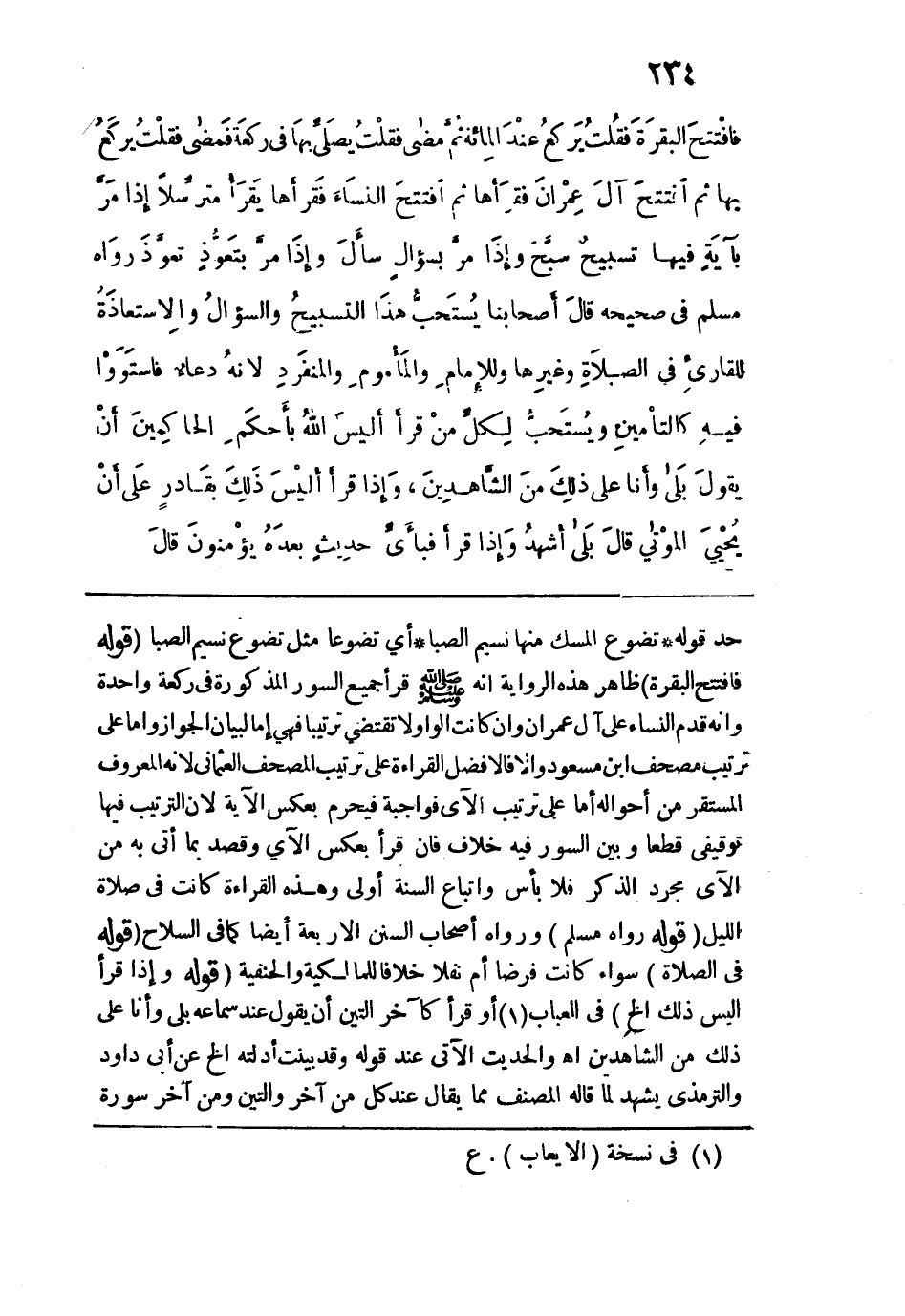 حد قول: تضوع المسك منها نسيم الصبا أي تضوعًا مثل تضوع نسيم الصبا. قوله: (فافْتتحَ البقرَةَ) ظاهر هذه الرواية إنه - صلى الله عليه وسلم - قرأ جمع السور المذكورة في ركعة واحدة وأنه قدم النساء على آل عمران وإن كانت الواو لا تقتضي ترتيبًا فهي إما لبيان الجواز وإما على ترتبب مصحف ابن مسعود وإلا فالأفضل فضل القراءة على ترتيب المصحف العثماني لأنه المعروف المستقر من أحواله أما على ترتيب الآي فواجبة فيحرم بعكس الآية لأن الترتيب فيها توقيفي قطعًا وبين السور فيه خلاف فإن قرأ بعكس الآي وقصد بما أتى به من الآي مجرد الذكر فلا بأس واتباع السنة أولى وهذه القراءة كانت في صلاة الليل. قوله: (رَوَاه مُسلم) ورواه أصحاب السنن الأربعة أيضًا كما في السلاح. قوله: (في الصَّلاةِ) سواء كانت فرضًا أم نفلًا خلافًا للمالكية والحنفية. قوله: (وإذَا قَرأَ أَليْسَ ذَلِكَ إلخ) في العباب أو قرأ كآخر التين أن يقول عند سماعه بلى وأنا على ذلك من الشاهدين اهـ، والحديث الآتي عند قوله وقد بينت أدلته إلخ، عن أبي داود والترمذي يشهد لما قاله المصنف مما يقال عند كل من آخر والتين ومن آخر سورة