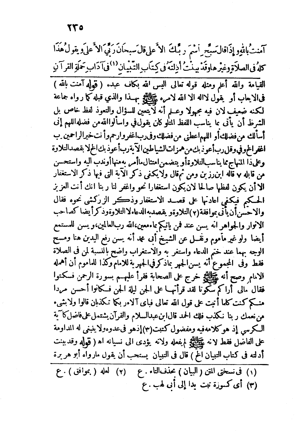[المؤمنون: 97] الآية رب أعوذ بك إلخ، لا بقصد التلاوة وعلى ذا المنهاج مما يناسب التلاوة أو يتضمن امتثال ما أمر به منها أو ندب إليه واستحسن من قابله قاله ابن رزين ومن ثم قال ولا يكفي ذكر الآية التي فيها ذكر الاستغفار إلَّا أن يكون لفظها صالحًا لأن يكون استغفارًا نحو واغفر لنا ربنا إنك أنت العزيز الحكيم فيكفي إعادتها على قصد الاستغفار وذكر الزركشي نحوه فقال والأحسن أن يأتي بموافقة التلاوة ويقصد به الدعاء لا التلاوة وذكر أيضًا كصاحب الأنوار والجواهر إنه يسن عند {فَمَنْ يَأْتِيكُمْ بِمَاءٍ مَعِينٍ (30)} [الملك: 30] الله رب العالمين، ويسن للمستمع أيضًا ولو غير مأموم ونقل عن الشيخ أبي محمد أنه يسن رفع اليدين هنا ومسح الوجه بهما عند ختم الدعاء واستغربه والاستغراب واضح بالنسبة لمن في الصلاة فقط وفي المجموع إنه يسن الجهر بما ذكر في الجهرية للإمام وكذا للمأموم أن أهمله الإمام وصح إنه - صلى الله عليه وسلم - خرج على الصحابة فقرأ عليهم بسورة الرحمن فسكتوا فقال ما لي أراكم سكوتًا لقد قرأتها على الجن ليلة الجن فكانوا أحسن مردًا منكم كنت كلما أتيت على قول الله تعالى: {فَبِأَيِّ آلَاءِ رَبِّكُمَا تُكَذِّبَانِ (13)} [الرحمن: 13] قالوا ولا بشيء من نعمك ربنا نكذب ذلك الحمد قال ابن عبد السلام والقرآن يشتمل على فاضل كآية الكرسي إذ هو كلامه فيه ومفضول كتبت إذ هو في عدوه ولا ينبغي له المداومة على الفاضل فقط لأنه - صلى الله عليه وسلم - لم يفعله ولأنه يؤدي إلى نسيانه اهـ. قوله: (وقَدْ بينْت أَدِلتَهُ في كِتاب التبْيانِ إلخ) قال في التبيان يستحب أن يقول ما رواه أبو هريرة