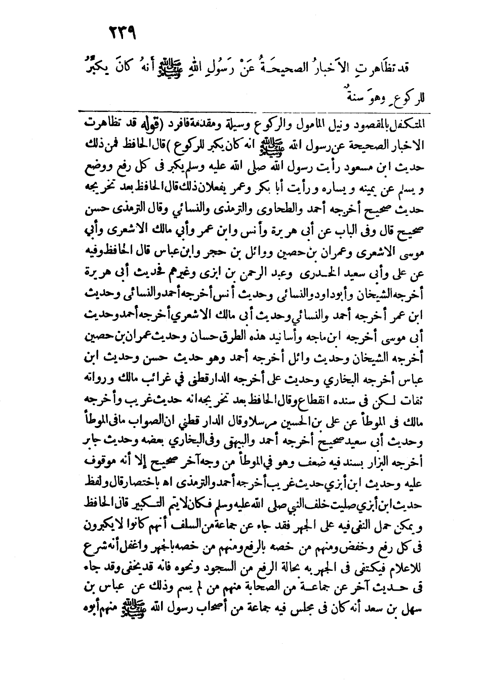 المتكفل بالمقصود ونيل المأمول والركوع وسيلة ومقدمة فأفرد. قوله: (قد تظَاهرتِ الأَخبارُ الصحيحَةُ عَنْ رَسُولِ الله - صلى الله عليه وسلم - أَنهُ كَانَ يكبرُ للركوعِ) قال الحافظ فمن ذلك حديث ابن مسعود رأيت رسول الله - صلى الله عليه وسلم - يكبر في كل رفع ووضع ويسلم عن يمينه ويساره ورأيت أبا بكر وعمر يفعلان ذلك قال الحافظ بعد تخريجه حديث صحيح أخرجه أحمد والطحاوي والترمذي والنسائي وقال الترمذي حسن صحيح قال وفي الباب عن أبي هريرة وأنس وابن عمر وأبي مالك الأشعري وأبي موسى الأشعري وعمران بن حصين ووائل بن حجر وابن عباس قال الحافظ وفيه عن علي وأبي سعيد الخدري وعبد الرحمن بن أبزى وغيرهم فحديث أبي هريرة أخرجه الشيخان وأبو داود والنسائي وحديث أنس أخرجه أحمد والنسائي وحديث ابن عمر أخرجه أحمد والنسائي وحديث أبي مالك الأشعري أخرجه أحمد وحديث أبي موسى أخرجه ابن ماجة وأسانيد هذه الطرف حسان وحديث عمران بن حصين أخرجه الشيخان وحديث وائل أخرجه أحمد وهو حديث حسن وحديث اين عباس أخرجه البخاري وحديث علي أخرجه الدارقطني في غرائب مالك ورواته ثقات لكن في سنده انقطاع وقال الحافظ بعد تخريجه إنه حديث غريب وأخرجه مالك في الموطأ عن علي بن الحسين مرسلًا وقال الدارقطني إن الصواب ما في الموطأ وحديث أبي سعيد صحيح أخرجه أحمد والبيهقي وفي البخاري بعضه وحديث جابر أخرجه البزار بسند فيه ضعف وهو في الموطأ من