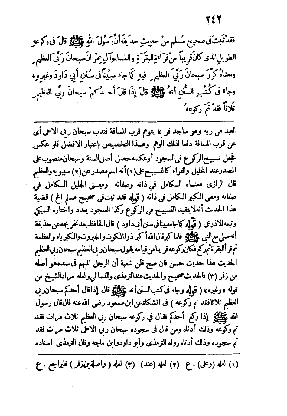 "وغيره". قوله: (وجاءَ في كتبِ السننِ أَنهُ - صلى الله عليه وسلم - قَال إِذَا قَال أحدكم سبحانَ ربي العظيم ثَلاثًا فقدْ تَم ركوعهُ) في المشكاة عن ابن مسعود رضي الله عنه قال قال رسول الله - صلى الله عليه وسلم - إذا ركع أحَدكم فقال في ركوعه سبحان ربي العظيم ثلاث مرات فقد تمّ ركوعه وذلك أدناه ومن قال في سجوده سبحان ربي الأعلى ثلاث مرات فقد تم سجوده وذلك أدناه رواه الترمذي وأبو داود وابن ماجة وقال الترمذي إسناده