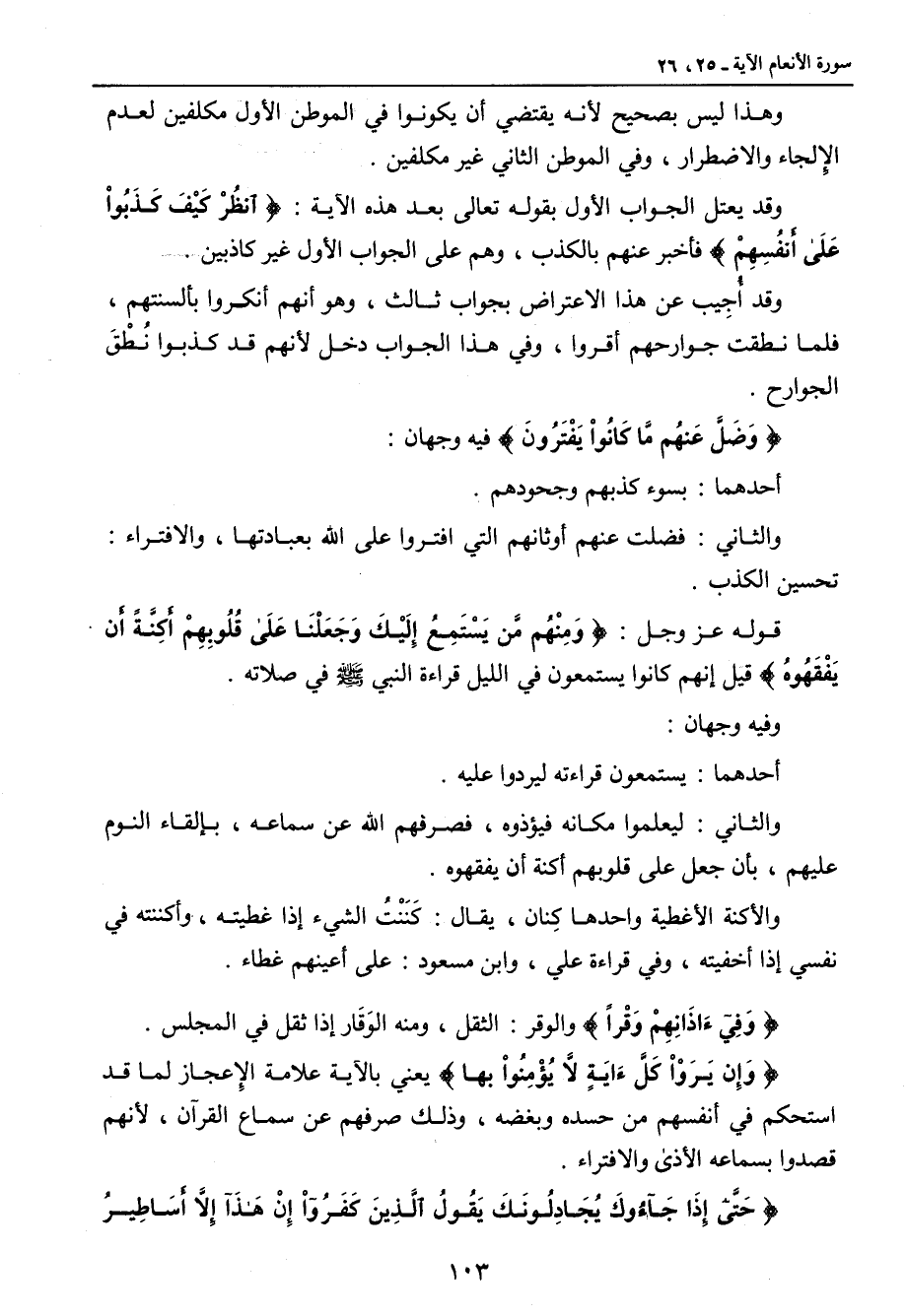 وهذا ليس بصحيح لأنه يقتضي أن يكونوا في الموطن الأول مكلفين لعدم الإِلجاء والاضطرار , وفي الموطن الثاني غير مكلفين. وقد يعتل الجواب الأول بقوله تعالى بعد هذه الآية: {انظُرْ كَيْفَ كَذَبُواْ عَلَى أَنفُسِهِمْ} فأخبر عنهم بالكذب , وهم على الجواب الأول غير كاذبين. وقد أُجِيب عن هذا الاعتراض بجواب ثالث , وهو أنهم أنكروا بألسنتهم , فلما نطقت جوارحهم أقروا , وفي هذا الجواب دخل لأنه قد كذبوا نُطْقَ الجوارح. {وَضَلَّ عَنهُم مَّا كَانُواْ يَفْتَرُونَ} فيه وجهان: أحدهما: بسوء كذبهم وجحودهم. والثاني: فضلت عنهم أوثانهم التي افتروا على الله بعبادتها , والافتراء: تحسين الكذب. قوله عز وجل: {وَمِنْهُمْ مَّن يَسْتَمِعُ إِلَيْكَ وَجَعَلْنَا عَلَى قُلُوبِهِمْ أَكِنَّةً أَن يَفْقَهُوهُ} قيل إنهم كانوا يستمعون في الليل قراءة النبي صلى الله عليه وسلم في صلاته. وفيه وجهان: أحدهما: يستمعون قراءته ليردوا عليه. والثاني: ليعلموا مكانه فيؤذوه , فصرفهم الله عن سماعه , بإلقاء النوم عليهم , بأن جعل على قلوبهم أكنة أن يفقهوه. والأكنة الأغطية واحدها كِنان , يقال: كَنَتْتُ الشيء إذا غطيته , وأكننته في نفسي إذا أخفيته , وفي قراءة علي , وابن مسعود: على أعينهم غطاء. {وَفِيءَاذَانِهِمْ وَقْراً} والوقر: الثقل , ومنه الوَقَار إذا ثقل في المجلس. {وَإِن يَرَوْاْ كَلَّءَايَةٍ لاَّ يُؤْمِنُواْ بها} يعني بالآية علامة الإعجاز لما قد استحكم في أنفسهم من حسده وبغضه , وذلك صرفهم عن سماع القرآن , لأنهم قصدوا بسماعه الأذى والافتراء. {حَتَّىَ إِذَا جَآءُوكَ يُجَادِلُونَكَ يَقُولُ الَّذِينَ كَفَرُواْ إِنْ هَذَآ إِلاَّ أَسَاطِيرُ