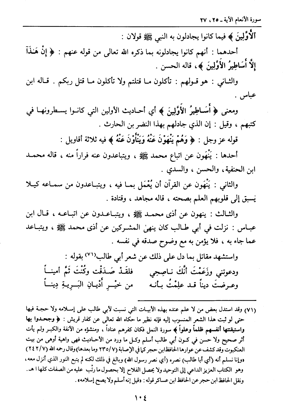 الأَوَّلِينَ} فيما كانوا يجادلون به النبي صلى الله عليه وسلم قولان: أحدهما: أنهم كانوا يجادلونه بما ذكره الله تعالى من قوله عنهم: {إِنْ هَذَآ إِلاَّ أَسَاطِيرُ الأَوَّلِينَ} , قال الحسن. والثاني: هو قولهم: تأكلون ما قتلتم ولا تاكلون ما قتل ربكم , قاله ابن عباس. ومعنى {أَسَاطِيرُ الأَوَّلِينَ} أي أحاديث الأولين التي كانوا يسطرونها في كتبهم , وقيل: إن جادلهم بهذا النضر بن الحارث. قوله عز وجل: {وَهُمْ يَنْهَوْنَ عَنْهُ وَيَنْأوْنَ عَنْهُ} فيه ثلاثة أقاويل: أحدها: يَنْهَون عن اتباع محمد صلى الله عليه وسلم , ويتباعدون عنه فراراً منه , قاله محمد ابن الحنفية , والحسن , والسدي. والثاني: يَنْهَون عن القرآن أن يُعْمَل بما فيه , ويتباعدون من سماعه كيلا يسبق إلى قلوبهم العلم بصحته , قاله مجاهد , وقتادة. والثالث: ينهون عن أذى محمد صلى الله عليه وسلم , ويتباعدون عن اتباعه , قال ابن عباس: نزلت في أبي طالب كان ينهى المشركين عن أذى محمد صلى الله عليه وسلم , ويتباعد عما جاء به , فلا يؤمن به مع وضوح صدقه في نفسه. واستشهد مقاتل بما دل على ذلك عن شعر أبي طالب بقوله: