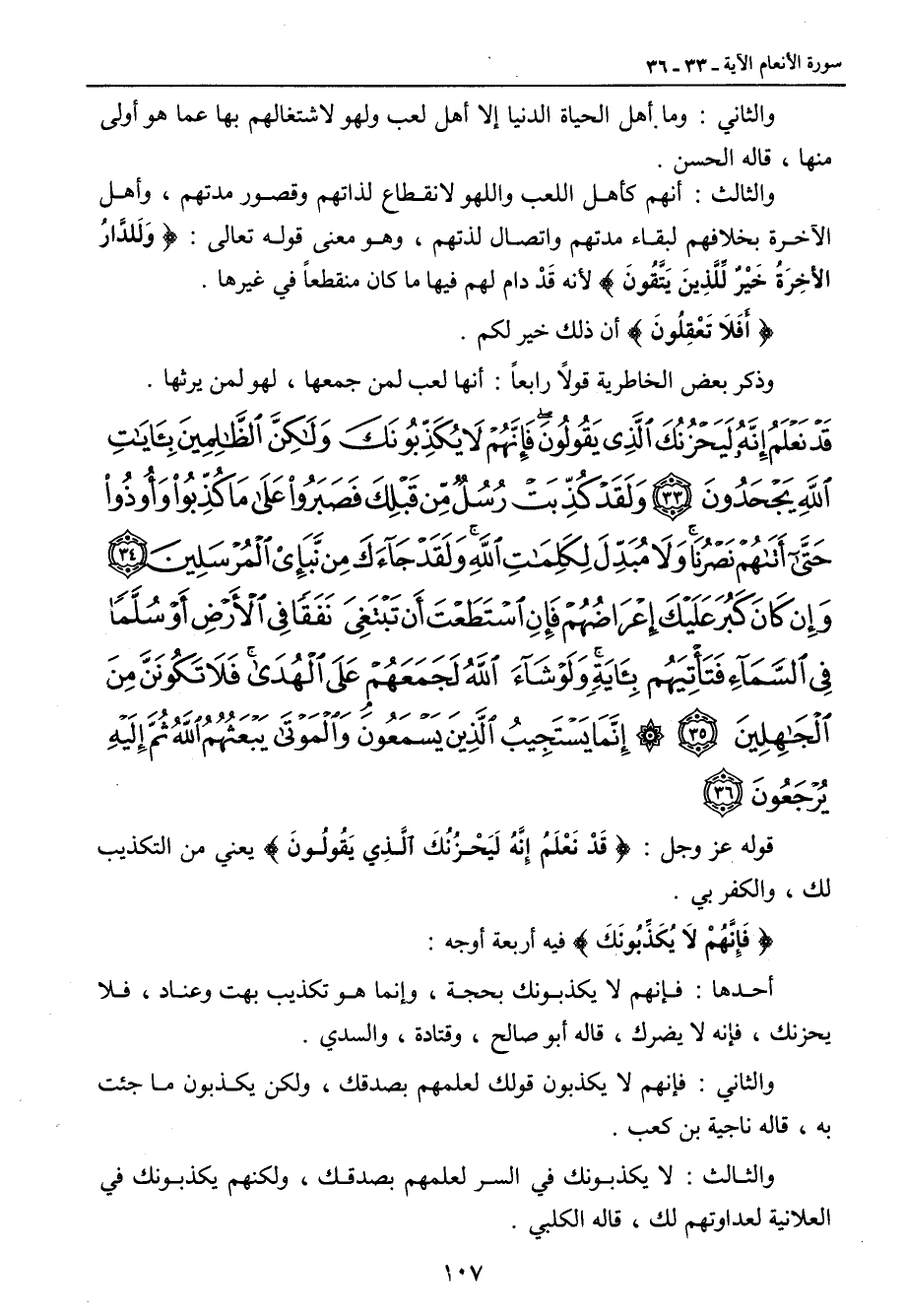 {قد نعلم إنه ليحزنك الذي يقولون فإنهم لا يكذبونك ولكن الظالمين بآيات الله يجحدون ولقد كذبت رسل من قبلك فصبروا على ما كذبوا وأوذوا حتى أتاهم نصرنا ولا مبدل لكلمات الله ولقد جاءك من نبإ المرسلين وإن كان كبر عليك إعراضهم فإن استطعت أن تبتغي نفقا في الأرض أو سلما في السماء فتأتيهم بآية ولو شاء الله لجمعهم على الهدى فلا تكونن من الجاهلين إنما يستجيب الذين يسمعون والموتى يبعثهم الله ثم إليه يرجعون} قوله عز وجل: {قَدْ نَعْلَمُ إِنَّهُ لَيَحْزنُكَ الَّذِي يَقُولُونَ} يعني من التكذيب. لك , والكفر بي. {فَإِنَّهُمْ لاَ يُكّذَّبونَكَ} فيه أربعة أوجه: أحدها: فإنهم لا يكذبونك بحجة , وإنما هو تكذيب بهت وعناد , فلا يحزنك , فإنه لا يضرك , قاله أبو صالح , وقتادة , والسدي. والثاني: فإنهم لا يكذبون قولك لعلمهم بصدقك , ولكن يكذبون ما جئت به , قاله ناجية بن كعب. والثالث: لا يكذبونك في السر لعلمهم بصدقك , ولكنهم يكذبونك في العلانية لعداوتهم لك , قاله الكلبي.