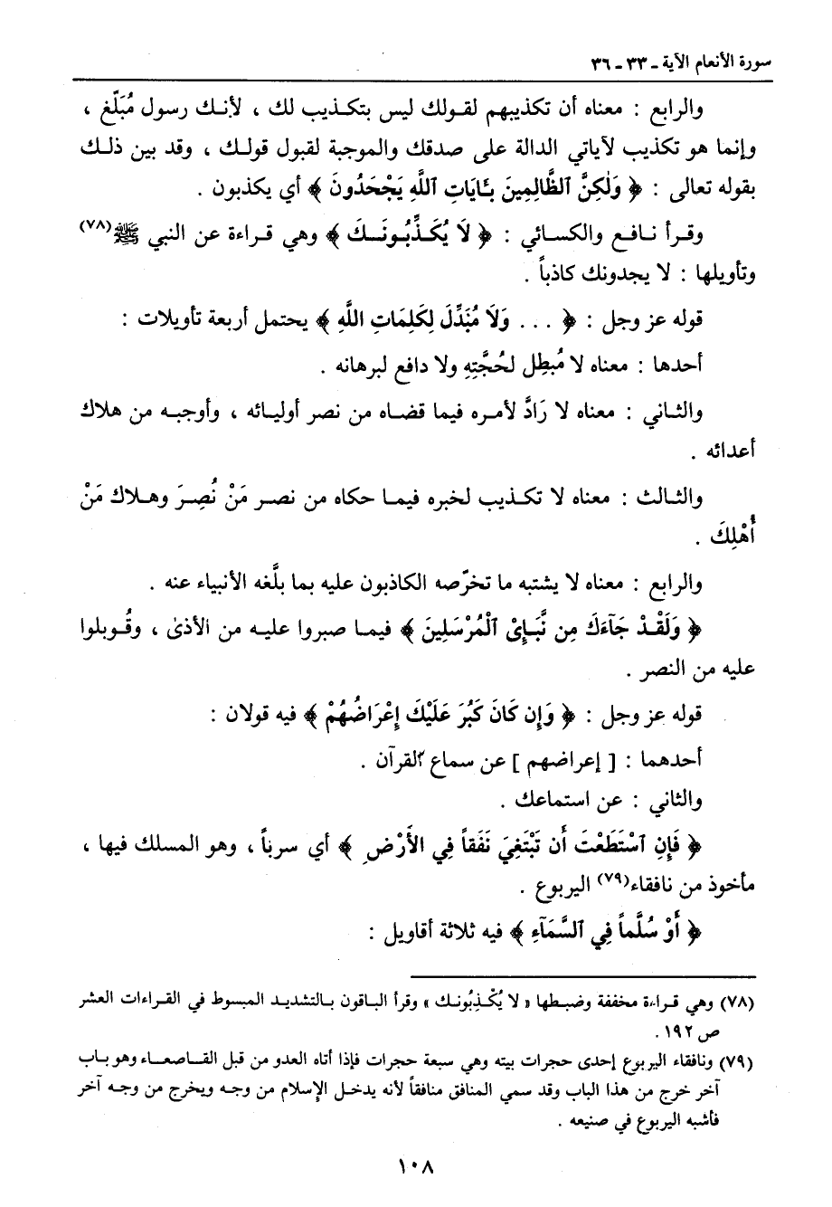والرابع: معناه أن تكذيبهم لقولك ليس بتكذيب لك , لأنك رسول مُبَلّغ , وإنما هو تكذيب لآياتي الدالة على صدقك والموجبة لقبول قولك , وقد بين ذلك بقوله تعالى: {وَلَكِنَّ الظَّالِمِينَ بئَأَيَاتِ اللَّهِ يَجْحَدُونَ} أي يكذبون. وقرأ نافع والكسائي: {لاَ يُكَذِّبُونَكَ} وهي قراءة عن النبي صلى الله عليه وسلم وتأويلها: لا يجدونك كاذباً. قوله عز وجل: { ... وَلاَ مُبَدِّلَ لِكَلِمَاتِ اللَّهِ} يحتمل أربعة تأويلات: أحدها: معناه لا مُبطِل لحُجَّتِهِ ولا دافع لبرهانه. والثاني: معناه لا رَادَّ لأمره فيما قضاه من نصر أوليائه , وأوجبه من هلاك أعدائه. والثالث: معناه لا تكذيب لخبره فيما حكاه من نصر مَنْ نُصِرَ وهلاك مَنْ أُهْلِكَ. والرابع: معناه لا يشتبه ما تخرّصه الكاذبون عليه بما بلَّغه الأنبياء عنه. {وَلَقْدْ جَآءَكَ مِن نَّبَإِىْ الْمُرْسَلِينَ} فيما صبروا عليه من الأذى , وقُوبلوا عليه من النصر. قوله عز وجل: {وَإِن كَانَ كَبُرَ إِعْرَاضُهُمْ} فيه قولان: أحدهما: [إعراضهم] عن سماع القرآن. والثاني: عن استماعك. {فَإِنِ اسْتَطَعْتَ أَن تَبْتَغِيَ نَفَقاً فِي الأَرْضِ} أي سرباً , وهو المسلك فيها , مأخوذ من نافقاء اليربوع. {أَوْ سُلَّماً فِي السَّمَآءِ} فيه ثلاثة أقاويل: