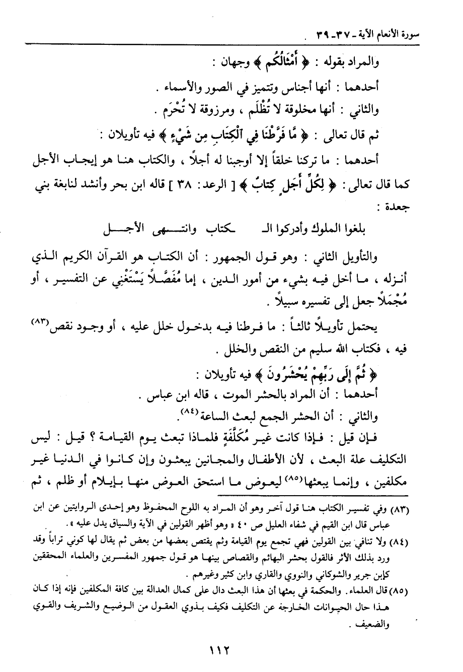 والتأويل الثاني: وهو قول الجمهور: أن الكتاب هو القرآن الكريم الذي أنزله , ما أخل فيه بشيء من أمور الدين , إما مُفَصَّلاً يَسْتَغْنِي عن التفسير , أو مجْمَلاً جعل إلى تفسيره سبيلاً. يحتمل تأويلاً ثالثاً: ما فرطنا فيه بدخول خلل عليه , أو وجود نقص فيه , فكتاب الله سليم من النقص والخلل. {ثُمَّ إِلَى رَبِّهِمْ يُحْشَرْونَ} فيه تأويلان: أحدهما: أن المراد بالحشر الموت , قاله ابن عباس. والثاني: أن الحشر الجمع لبعث الساعة. فإن قيل: فإذا كانت غير مُكَلَّفَةٍ فلماذا تبعث يوم القيامة؟ قيل: ليس التكليف علة البعث , لأن الأطفال والمجانين يبعثون وإن كانوا في الدنيا غير مكلفين , وإنما يبعثها ليعوض ما استحق العوض منها بإيلام أو ظلم , ثم