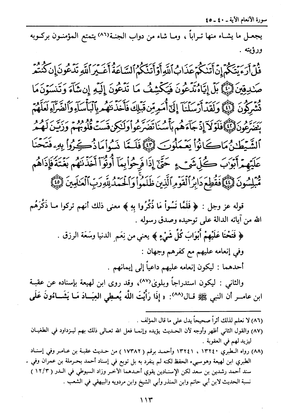 {قل أرأيتكم إن أتاكم عذاب الله أو أتتكم الساعة أغير الله تدعون إن كنتم صادقين بل إياه تدعون فيكشف ما تدعون إليه إن شاء وتنسون ما تشركون ولقد أرسلنا إلى أمم من قبلك فأخذناهم بالبأساء والضراء لعلهم يتضرعون فلولا إذ جاءهم بأسنا تضرعوا ولكن قست قلوبهم وزين لهم الشيطان ما كانوا يعملون فلما نسوا ما ذكروا به فتحنا عليهم أبواب كل شيء حتى إذا فرحوا بما أوتوا أخذناهم بغتة فإذا هم مبلسون فقطع دابر القوم الذين ظلموا والحمد لله رب العالمين} قوله عز وجل: {فَلَمَّا نَسُواْ مَا ذُكَّرُوا بِهِ} معنى ذلك أنهم تركوا ما ذَكَّرَهُم الله من آياته الدالة على توحيده وصدق رسوله. {فَتَحْنَا عَلَيْهِمُ أَبْوَابَ كُلِّ شَيْءٍ} يعني من نِعَمِ الدنيا وسَعَة الرزق. وفي إنعامه عليهم مع كفرهم وجهان: أحدهما: ليكون إنعامه عليهم داعياً إلى إيمانهم. والثاني: ليكون استدراجاً وبلوى , وقد روى ابن لهيعة بإسناده عن عقبة ابن عامر أن النبي صلى الله عليه وسلم قال: (إِذَا رَأَيْتَ اللَّه يعِطي العِبَادَ مَا يَشَاءُونَ عَلَى