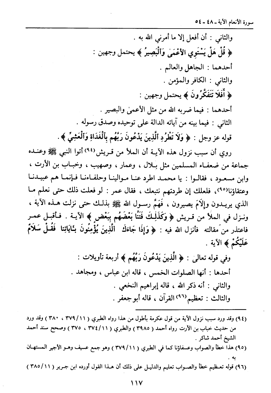 والثاني: أن أفعل إلا ما أمرني الله به. {قُلْ هَلْ يَسْتَوِي الأعْمَى وَالْبَصِيرُ} يحتمل وجهين: أحدهما: الجاهل والعالم. والثاني: الكافر والمؤمن. {أَفَلاَ تَتَفَكَّرُونَ} يحتمل وجهين: أحدهما: فيما ضربه الله من مثل الأعمى والبصير. الثاني: فيما بينه من آياته الدالة على توحيده وصدق رسوله. قوله عز وجل: {وَلاَ تَطْرُدِ الَّذِينَ يَدْعُونَ رَبَّهُم بِالْغَدَاةِ وَالْعَشِّي}. روي أن سبب نزول هذه الآية أن الملأ من قريش أتوا النبي صلى الله عليه وسلم وعنده جماعة من ضعفاء المسلمين مثل بلال , وعمار , وصهيب , وخباب بن الأرت , وابن مسعود , فقالوا: يا محمد اطرد عنا موالينا وحلفاءنا فإنما هم عبيدنا وعتقاؤنا , فلعلك إن طردتهم نتبعك , فقال عمر: لو فعلت ذلك حتى نعلم ما الذي يريدون وإِلاَمَ يصيرون , فَهَمَّ رسول الله صلى الله عليه وسلم بذلك حتى نزلت هذه الآية. ونزل في الملأ من قريش {وَكَذَلِكَ فَتَنَّا بَعْضَهُم بِبَعْضٍ} الآية , فأقبل عمر فاعتذر من مقالته فأنزل الله فيه: {وَإِذَا جَاءَكَ الَّذِينَ يُؤْمَنُونَ بِئَأَيَاتِنا فَقُلْ سَلاَمٌ عَلَيْكُمْ} الآية. وفي قوله تعالى: {الَّذِينَ يَدْعُونَ رَبَّهُم} أربعة تأويلات: أحدها: أنها الصلوات الخمس , قاله ابن عباس , ومجاهد. والثاني: أنه ذكر الله , قاله إبراهيم النخعي. والثالث: تعظيم القرآن , قاله أبو جعفر.