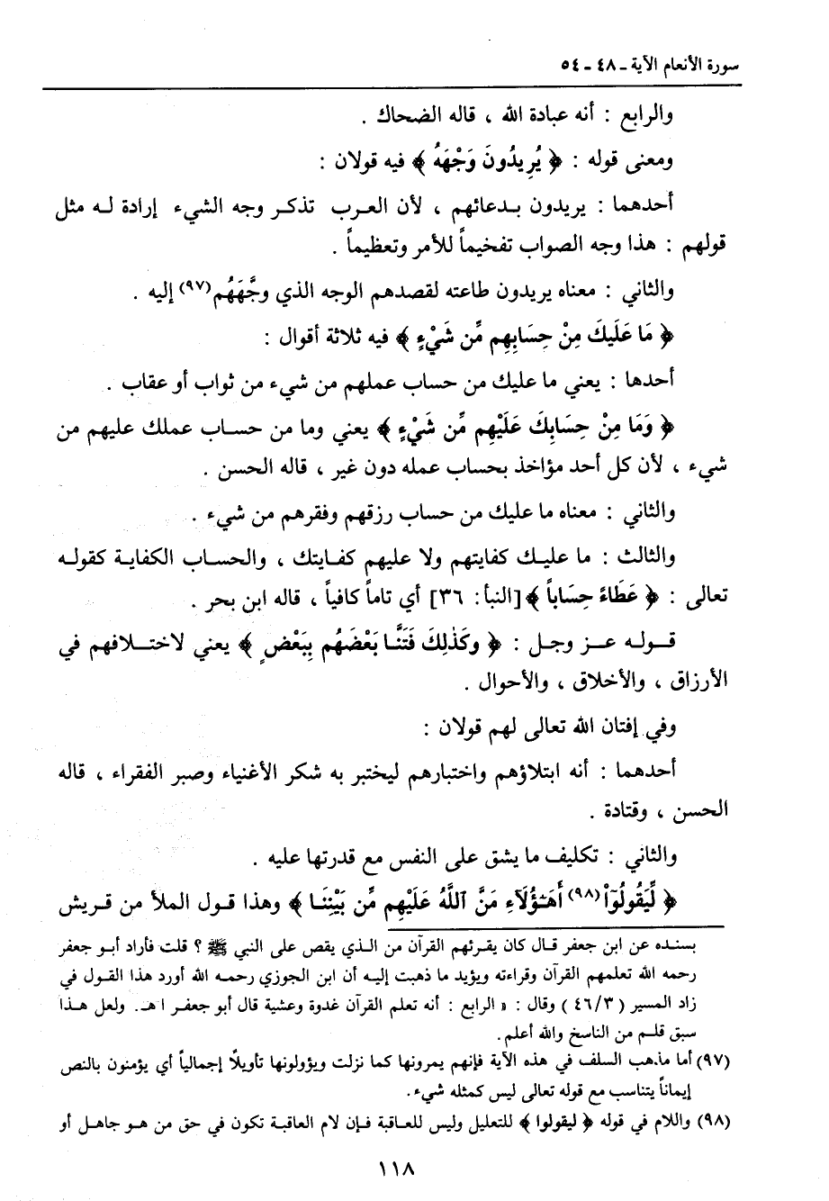 والرابع: أنه عبادة الله , قاله الضحاك. ومعنى قوله: {يُرِيدُونَ وَجْهَهُ} فيه قولان: أحدهما: يريدون بدعائهم , لأن العرب تذكر وجه الشيء إرادة له مثل قولهم: هذا وجه الصواب تفخيماً للأمر وتعظيماً. والثاني: معناه يريدون طاعته لقصدهم الوجه الذي وجَّهَهُم إليه. {مَا عَلَيكَ مِنْ حِسَابِهِم مِّن شَيْءٍ} فيه ثلاث أقوال: أحدها: يعني ما عليك من حساب عملهم من شيء من ثواب أو عقاب. {وَمَا مِنْ حِسابِكَ عَلَيْهِم مِّن شَيْءٍ} يعني وما من حساب عملك عليهم من شيء , لأن كل أحد مؤاخذ بحساب عمله دون غير , قاله الحسن. والثاني: معناه ما عليك من حساب رزقهم وفقرهم من شيء. والثالث: ما عليك كفايتهم ولا عليهم كفايتك , والحساب الكفاية كقوله تعالى: {عَطَاءً حِسَاباً} [النبأ: 36] أي تاماً كافياً , قاله ابن بحر. قوله عز وجل: {وَكَذلِكَ فَتَنَّا بَعْضَهُم بِبَعْضٍ} يعني لاختلافهم في الأرزاق , والأخلاق , والأحوال. وفي إفتان الله تعالى لهم قولان: أحدهما: أنه ابتلاؤهم واختبارهم ليختبر به شكر الأغنياء وصبر الفقراء , قاله الحسن , وقتادة. والثاني: تكليف ما يشق على النفس مع قدرتها عليه. {لَّيَقُولُواْ أَهَؤُلآءِ مَنَّ اللَّهُ عَلَيْهِم مِّن بَيْنِنَا} وهذا قول الملأ من قريش