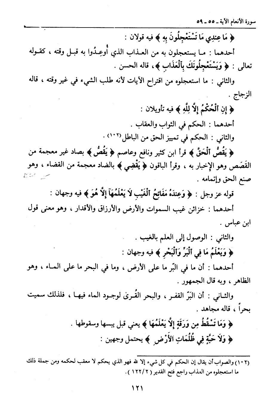 {مَا عِندِي مَا تَسْتَعْجِلُونَ} فيه قولان: أحدهما: ما يستعجلون به من العذاب الذي أُوعِدُوا به قبل وقته , كقوله تعالى: {وَيَسْتَعْجِلُونَكَ بِالْعَذَابِ} , قاله الحسن. والثاني: ما استعجلوه من اقتراح الآيات لأنه طلب الشيء فى غير وقته , قاله الزجاج. {إِنِ الْحُكْمُ إِلاَّ لِلَّهِ} فيه تأويلان: أحدهما: الحكم في الثواب والعقاب. والثاني: الحكم في تمييز الحق من الباطل. {يَقُصُّ الْحَقَّ} قرأ ابن كثير ونافع وعاصم {يَقُصُّ} بصاد غير معجمة من القَصَص وهو الإِخبار به , وقرأ الباقون {يَقْضِي} بالضاد معجمة من القضاء , وهو صنع الحق وإتمامه. قوله عز وجل: {وَعِندَهُ مَفَاتِحُ الْغَيْبِ لاَ يَعْلَمُهَا إِلاَّ هُوَ} فيه وجهان: أحدهما: خزائن غيب السموات والأرض والأرزاق والأقدار , وهو معنى قول ابن عباس. والثاني: الوصول إلى العلم بالغيب. {وَيَعْلَمُ مَا فِي الْبَرِّ وَالْبَحْرِ} فيه وجهان: أحدهما: أن ما في البّر ما على الأرض , وما في البحر ما على الماء , وهو الظاهر , وبه قال الجمهور. والثاني: أن البَرّ القفر , والبحر القُرى لوجود الماء فيها , فلذلك سميت بحراً , قاله مجاهد. {وَمَا تَسْقُطُ مِن وَرَقَةٍ إِلاَّ يَعْلَمُهَا} يعني قبل يبسها وسقوطها. {وَلاَ حَبَّةٍ فِي ظُلُمَاتِ الأرْضِ} يحتمل وجهين: