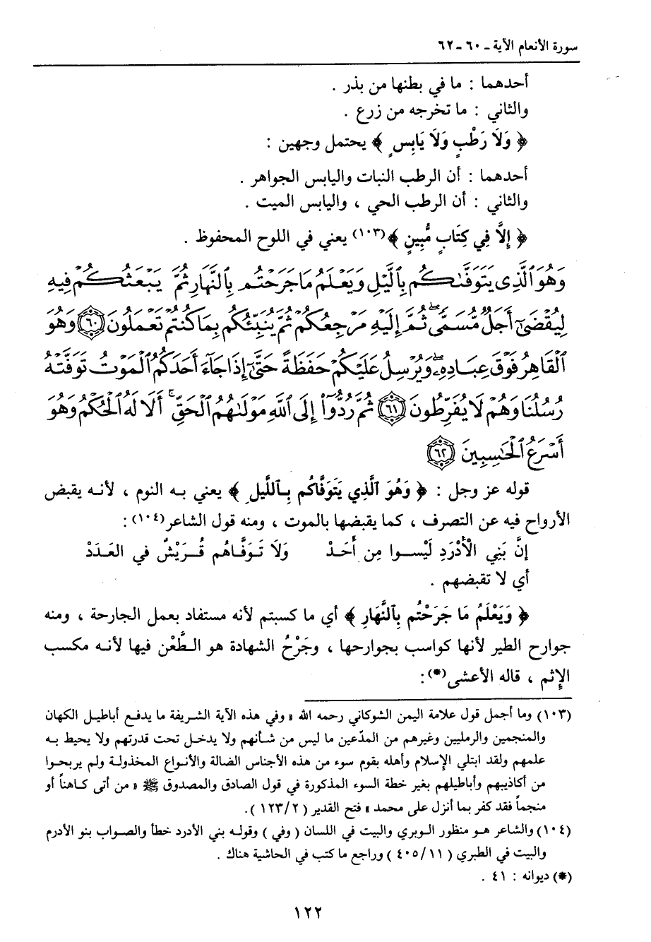 {وهو الذي يتوفاكم بالليل ويعلم ما جرحتم بالنهار ثم يبعثكم فيه ليقضى أجل مسمى ثم إليه مرجعكم ثم ينبئكم بما كنتم تعملون وهو القاهر فوق عباده ويرسل عليكم حفظة حتى إذا جاء أحدكم الموت توفته رسلنا وهم لا يفرطون ثم ردوا إلى الله مولاهم الحق ألا له الحكم وهو أسرع الحاسبين} قوله عز وجل: {وَهُوَ الَّذِي يَتَوَفَّاكُم بِاللَّيلِ} يعني به النوم , لأنه يقبض الأرواح فيه عن التصرف , كما يقبضها بالموت , ومنه قول الشاعر: