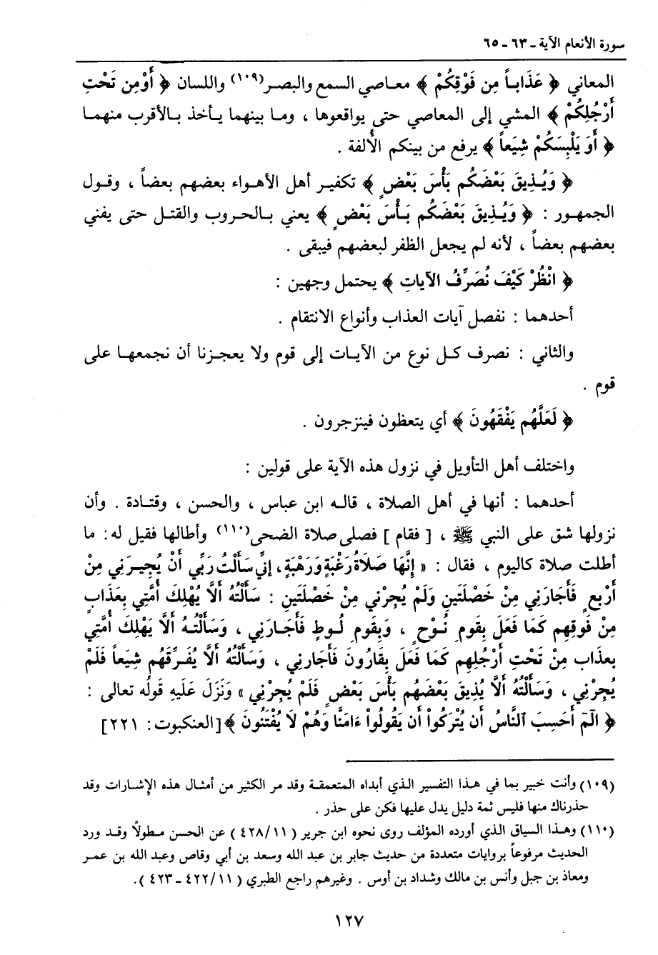 المعاني {عَذَاباً مِن فَوقِكُمْ} معاصي السمع والبصر واللسان {أَوْمِن تَحْتِ أَرْجلِكُمْ} المشي إلى المعاصي حتى يواقعوها , وما بينهما يأخذ بالأقرب منهما {أَوَيَلْبِسَكُمْ شِيَعاً} يرفع من بينكم الأُلفة. {وَيُذِيقَ بَعْضَكُم بَأْسَ بَعْضٍ} تكفير أهل الأهوال بعضهم بعضاً , وقول الجمهور: {وَيُذِيقَ بَعْضَكُم بَأْسَ بَعْضٍ} يعني بالحروب والقتل حتى يفني بعضهم بعضاً , لأنه لم يجعل الظفر لبعضهم فيبقى. {انْظُرْ كَيْفَ نُصَرِّفُ الآياتِ} يحتمل وجهين: أحدهما: نفصل آيات العذاب وأنواع الانتقام. والثاني: نصرف كل نوع من الآيات إلى قوم ولا يعجزنا أن نجمعها على قوم. {لَعَلَّهُم يَفْقَهُونَ} أي يتعظون فينزجرون. واختلف أهل التأويل في نزول هذه الآية على قولين: أحدهما: أنها في أهل الصلاة , قاله ابن عباس , والحسن , وقتادة , وأن نزولها شق على النبي صلى الله عليه وسلم , [فقام] فصلى صلاة الضحى وأطالها فقيل له: ما أطلت صلاة كاليوم , فقال: (إِنَّهَا صَلاَةُ رَغْبَةٍ وَرَهْبَةٍ , إنِّي سَأَلْتُ رَبِّي أَنْ يُجِيرَنِي مِنْ أَرْبعٍ فَأَجَارَنِي مِنْ خَصْلَتِينِ وَلَمْ يُجِرْنِي مِنْ خَصْلَتَينِ: سَأَلْتُهُ أَلاَّ يُهْلِكَ أُمَّتِي بِعَذَابٍ مِنْ فَوقِهِم كَمَا فَعَلَ بِقَومِ نُوْحٍ , وَبِقَومِ لُوطٍ فَأَجَارَنِي , وَسَأَلْتُهُ أَلاَّ يَهْلِكَ أُمَّتِي بعذَاب مِنْ تَحْتِ أَرْجلِهِم كَمَا فَعَلَ بِقَارُونَ فَأَجَارنِي , وَسَأَلْتُهُ أََلاَّ يُفَرِّقَهُمْ شِيَعاً فَلَمْ يُجِرْنِي , وَسَأَلْتُهُ أَلاَّ يُذِيقَ بَعْضَهُم بَأْسَ بَعْضٍ فَلَمْ يُجِرْنِي) وَنَزَلَ عَلَيهِ قَولُه تعالى: {الم أحَسِبَ النَّاسُ أَن يُتْرَكُواْ أَن يَقُولُواْءَامَنَّا وَهُمْ لاَ يُفْتَنُونَ} [العنكبوت: 221]