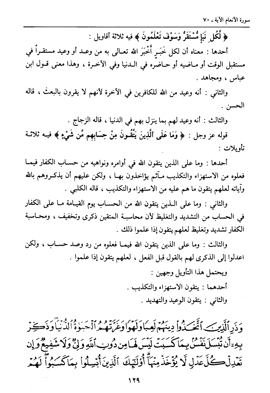{لِّكُلِ نَبَإٍ مُّسْتَقَرٌّ وَسَوْفَ تَعْلَمُونَ} فيه ثلاثة أقاويل: أحدهما: معناه أن لكل خَبَرٍ أَخْبَرَ الله تعالى به من وعد أو وعيد مستقراً في مستقبل الوقت أو ماضيه أو حاضره في الدنيا وفي الآخرة , وهذا معنى قول ابن عباس , ومجاهد. والثاني: أنه وعيد من الله للكافرين في الآخرة لأنهم لا يقرون بالبعث , قاله الحسن. والثالث: أنه وعيد لهم بما ينزل بهم في الدنيا , قاله الزجاج. قوله عز وجل: {وَمَا عَلَى الَّذِينَ يَتَّقُونَ مِنْ حِسَابِهِم مِّن شَيْءٍ} فيه ثلاثة تأويلات: أحدها: وما على الذين يتقون الله في أوامره ونواهيه من حساب الكفار فيما فعلوه من الاستهزاء والتكذيب مآثم يؤاخذون بها , ولكن عليهم أن يذكروهم بالله وآياته لعلهم يتقون ما هم عليه من الاستهزاء والتكذيب , قاله الكلبي. والثاني: وما على الذين يتقون الله من الحساب يوم القيامة ما على الكفار في الحساب من التشديد والتغليظ لأن محاسبة المتقين ذكرى وتخفيف , ومحاسبة الكفار تشديد وتغليظ لعلهم يتقون إذا علموا ذلك. والثالث: وما على الذين يتقون الله فيما فعلوه من رد وصد حساب , ولكن اعدلوا إلى الذكرى لهم بالقول قبل الفعل , لعلهم يتقون إذا علموا. ويحتمل هذا التأويل وجهين: أحدهما: يتقون الاستهزاء والتكذيب. والثاني: يتقون الوعيد والتهديد.