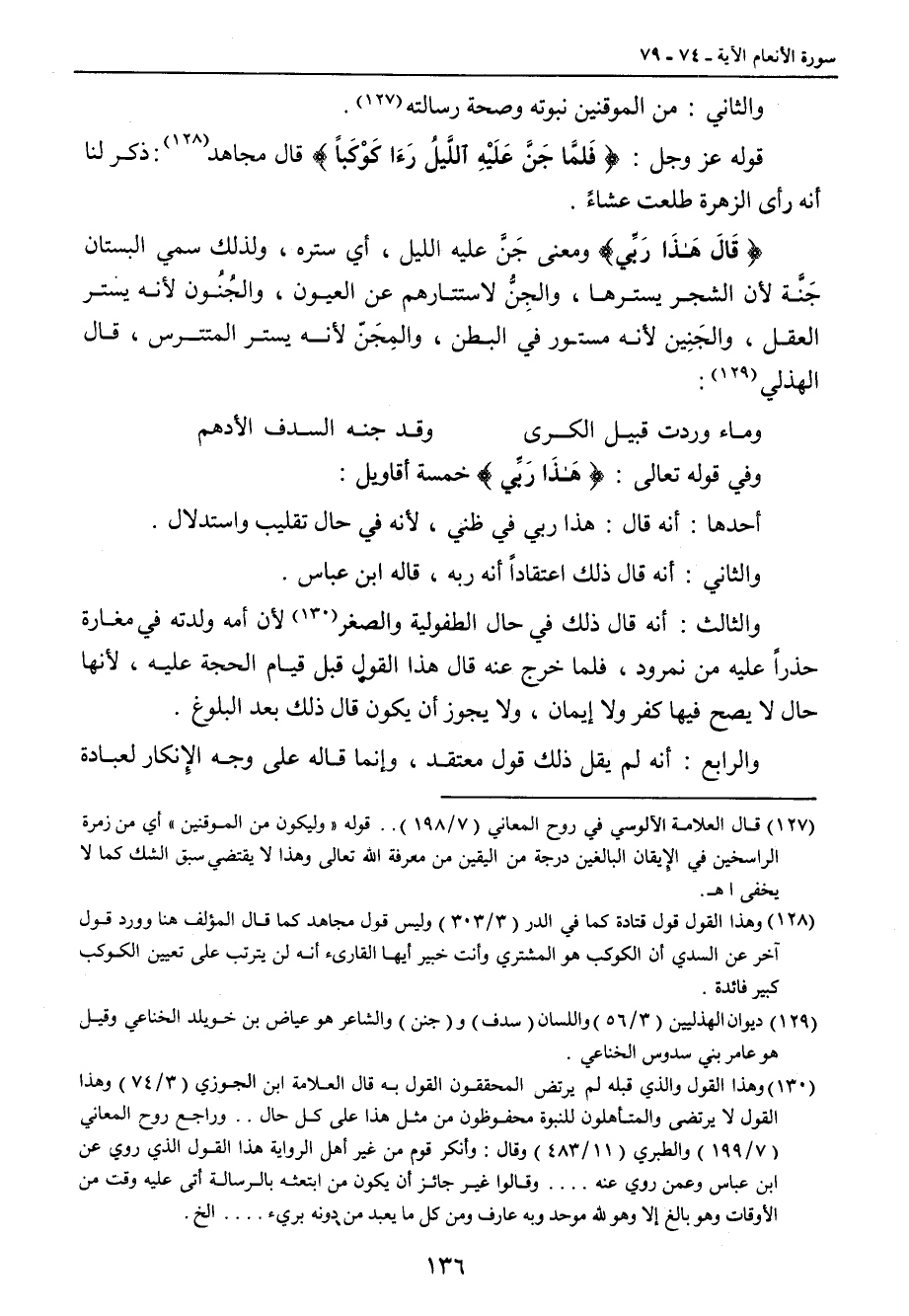 وفي قوله تعالى: {هَذَا رَبِّي} خمسة أقاويل: أحدها: أنه قال: هذا ربي في ظني , لأنه في حال تقليب واستدلال. والثاني: أنه قال ذلك اعتقاداً أنه ربه , قاله ابن عباس. والثالث: أنه قال ذلك في حال الطفولية والصغر , لأن أمه ولدته في مغارة حذراً عليه من نمرود , فلما خرج عنه قال هذا القول قبل قيام الحجة عليه , لأنها حال لا يصح فيها كفر ولا إيمان , ولا يجوز أن يكون قال ذلك بعد البلوغ. والرابع: أنه لم يقل ذلك قول معتقد , وإنما قاله على وجه الإِنكار لعبادة