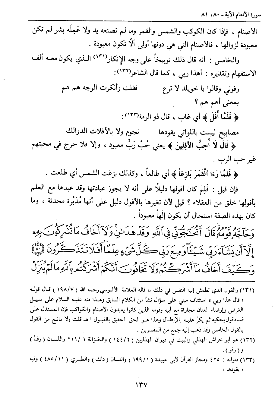 {قَالَ لاَ أُحِبُّ الأفِلِينَ} يعني حُبَّ رَبٍّ معبود , وإلا فلا حرج في محبتهم غير حب الرب. {فَلمَّا رَءَا الْقَمَرَ بَازِغاً} أي طالعاً , وكذلك بزغت الشمس أي طلعت. فإن قيل: فَلِمَ كان أفولها دليلاً على أنه لا يجوز عبادتها وقد عبدها مع العلم بأفولها خلق من العقلاء؟ قيل لأن تغيرها بالأفول دليل على أنها مُدَبَّرة محدثة , وما كان بهذه الصفة استحال أن يكون إلهاً معبوداً.