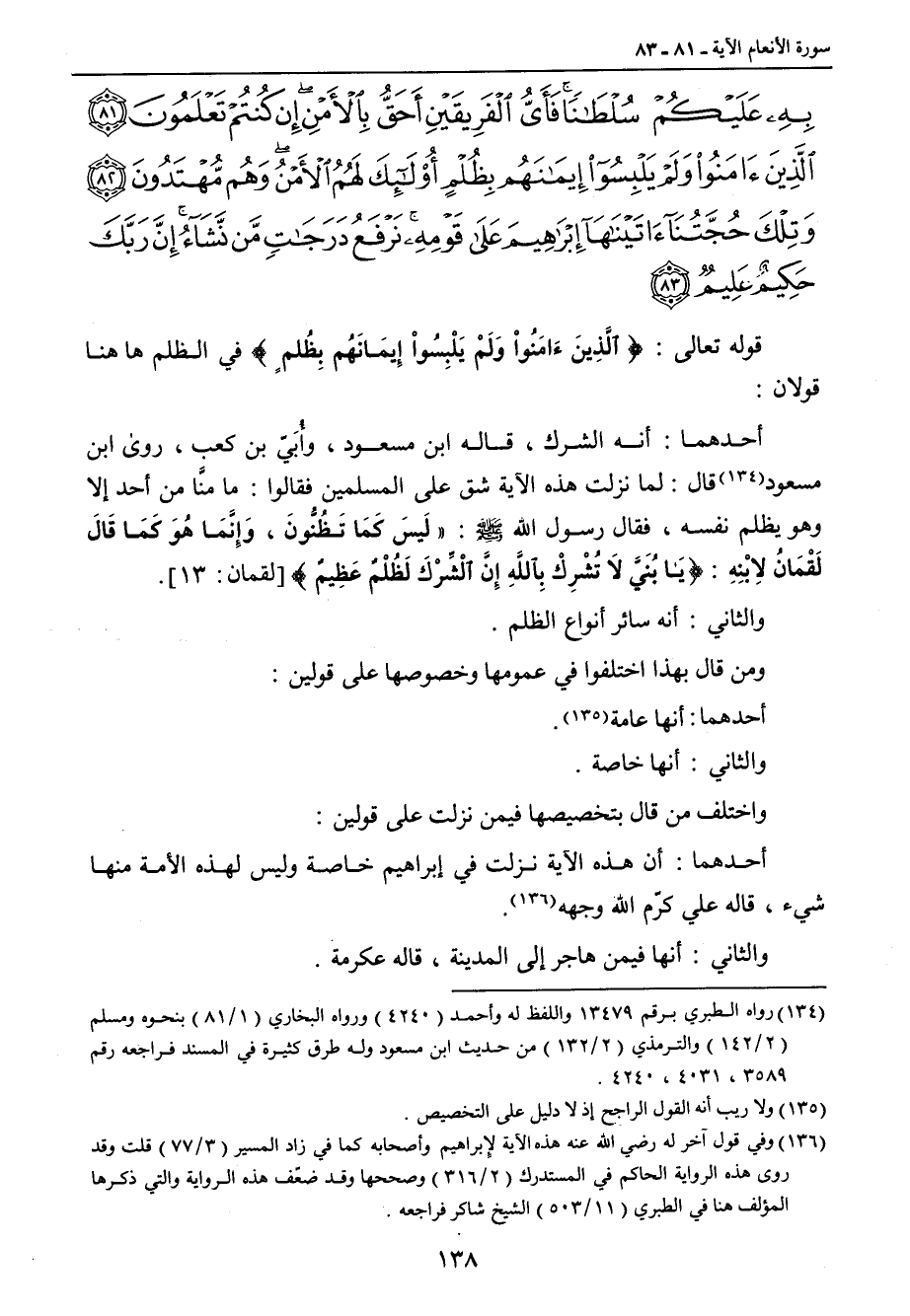 به عليكم سلطانا فأي الفريقين أحق بالأمن إن كنتم تعلمون الذين آمنوا ولم يلبسوا إيمانهم بظلم أولئك لهم الأمن وهم مهتدون وتلك حجتنا آتيناها إبراهيم على قومه نرفع درجات من نشاء إن ربك حكيم عليم} قوله تعالى: {الَّذِينَءَامَنُواْ وَلَمْ يَلْبِسُواْ إِيمَانَهُم بِظُلمٍ} في الظلم ها هنا قولان: أحدهما: أنه الشرك , قاله ابن مسعود , وأُبَيّ بن كعب , روى ابن مسعود قال: لما نزلت هذه الآية شق على المسلمين فقالوا: ما منَّا من أحد إلا وهو يظلم نفسه , فقال رسول الله صلى الله عليه وسلم: (لَيسَ كَمَا تَظُنُّونَ , وَإِنَّمَا هُوَ كَمَا قَالَ لَقْمَانُ لابْنِه} {يَا بُنَيَّ لاَ تُشْرِكْ بِاللَّهِ إِنَّ الْشِّرْكَ لَظُلْمٌ عَظِيمٌ} [لقمان: 13]. والثاني: أنه سائر أنواع الظلم. ومن قال بهذا اختلفوا في عمومها وخصوصها على قولين: أحدهما: أنها عامة. والثاني: أنها خاصة. واختلف من قال بتخصيصها فيمن نزلت على قولين: أحدهما: أن هذه الآية نزلت في إبراهيم خاصة وليس لهذه الأمة منها شيء , قاله علي كرّم الله وجهه. والثاني: أنها فيمن هاجر إلى المدينة , قاله عكرمة.