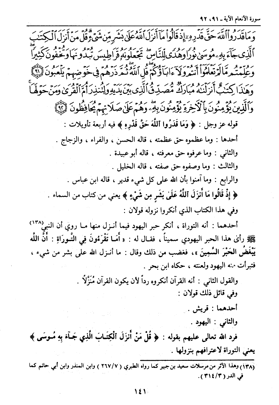 {وما قدروا الله حق قدره إذ قالوا ما أنزل الله على بشر من شيء قل من أنزل الكتاب الذي جاء به موسى نورا وهدى للناس تجعلونه قراطيس تبدونها وتخفون كثيرا وعلمتم ما لم تعلموا أنتم ولا آباؤكم قل الله ثم ذرهم في خوضهم يلعبون وهذا كتاب أنزلناه مبارك مصدق الذي بين يديه ولتنذر أم القرى ومن حولها والذين يؤمنون بالآخرة يؤمنون به وهم على صلاتهم يحافظون} قوله عز وجل: {وَمَا قَدَرُوا اللَّهَ حَقَّ قَدْرِهِ} فيه أربعة تأويلات: أحدها: وما عظموه حق عظمته , قاله الحسن , والفراء , والزجاج. والثاني: وما عرفوه حق معرفته , قاله أبو عبيدة. والثالث: وما وصفوه حق صفته , قاله الخليل. والرابع: وما آمنوا بأن الله على كل شيء قدير , قاله ابن عباس. {إِذْ قَالُوا مَا أَنزَلَ اللَّهُ عَلَى بَشَرٍ مِن شَيْءٍ} يعني من كتاب من السماء. وفي هذا الكتاب الذي أنكروا نزوله قولان: أحدهما: أنه التوراة , أنكر حبر اليهود فيما أنزل منها ما روي أن النبي صلى الله عليه وسلم رأى هذا الحبر اليهودي سميناً , فقال له: (أَمَا تَقْرَءُونَ فِي التَّورَاةِ: أَنَّ اللَّه يَبْغَضُ الحَبْرَ السَّمِينَ) فغضب من ذلك وقال: ما أنزل الله على بشر من شيء , فتبرأت منه اليهود ولعنته , حكاه ابن بحر. والقول الثاني: أنه القرآن أنكروه رداً لأن يكون القرآن مُنَزَّلاً. وفي قائل ذلك قولان: أحدهما: قريش. والثاني: اليهود. فرد الله تعالى عليهم بقوله: {قُلْ مَنْ أَنْزَلَ الْكِتَابَ الَّذِي جَآءَ بِهِ مُوسَى} يعني التوراة لاعترافهم بنزولها.