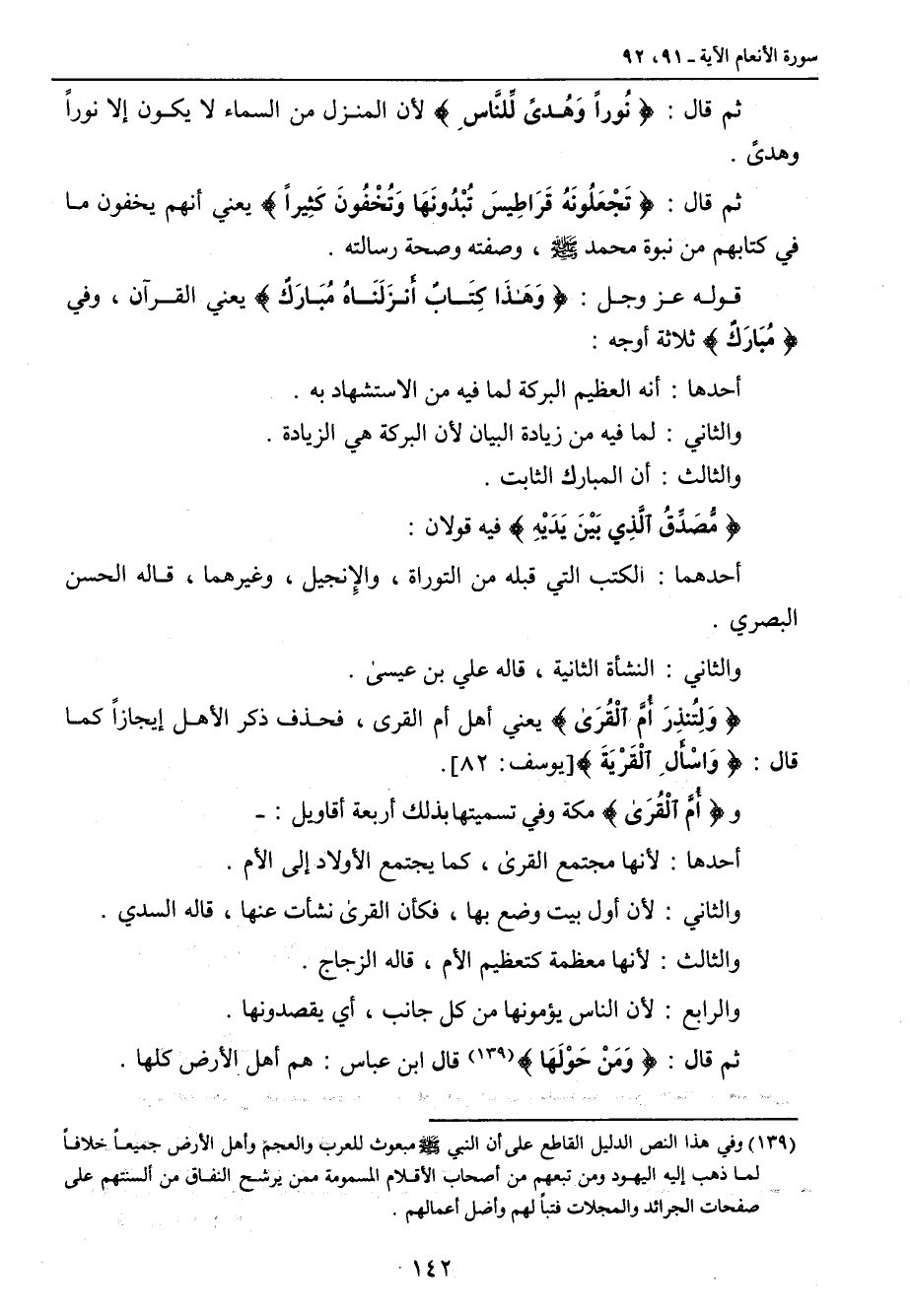 ثم قال: {نُوراً وَهُدىً لِّلنَّاسِ} لأن المنزل من السماء لا يكون إلا نوراً وهدىً. ثم قال: {تَجْعَلُونَهُ قَرَاطِيسَ تُبْدُونَهَا وَتُخْفُونَ كَثِيراً} يعني أنهم يخفون ما في كتابهم من بنوة محمد صلى الله عليه وسلم , وصفته وصحة رسالته. قوله عز وجل: {وَهَذَا كِتَابٌ أَنزَلَنَاهُ مُبَارَكٌ} يعني القرآن , وفي {مُبارَكٌ} ثلاثة أوجه: أحدها: أنه العظيم البركة لما فيه من الاستشهاد به. والثاني: لما فيه من زيادة البيان لأن البركة هي الزيادة. والثالث: أن المبارك الثابت. {مُّصَدِقُ الَّذِي بَيْنَ يَدَيْهِ} فيه قولان: أحدهما: الكتب التي قبله من التوراة , والإِنجيل , وغيرهما , قاله الحسن البصري. والثاني: النشأة الثانية , قاله علي بن عيسى. {وَلِتُنذِرَ أُمَّ الْقُرَى} يعني أهل أم القرى , فحذف ذكر الأهل إيجازاً كما قال: {وَاسْأَلِ الْقَرْيَةَ} [يوسف: 82]. و {أُمَّ الْقُرَى} مكة وفي تسميتها بذلك أربعة أقاويل: - أحدها: لأنها مجتمع القرى , كما يجتمع الأولاد إلى الأم. والثاني: لأن أول بيت وضع بها , فكأن القرى نشأت عنها , قاله السدي. والثالث: لأنها معظمة كتعظيم الأم , قاله الزجاج. والرابع: لأن الناس يؤمونها من كل جانب , أي يقصدونها. ثم قال: {وَمَنْ حَوْلَهَا} قال ابن عباس: هم أهل الأرض كلها.
