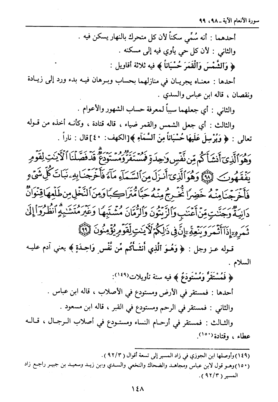 {وهو الذي أنشأكم من نفس واحدة فمستقر ومستودع قد فصلنا الآيات لقوم يفقهون وهو الذي أنزل من السماء ماء فأخرجنا به نبات كل شيء فأخرجنا منه خضرا نخرج منه حبا متراكبا ومن النخل من طلعها قنوان دانية وجنات من أعناب والزيتون والرمان مشتبها وغير متشابه انظروا إلى ثمره إذا أثمر وينعه إن في ذلكم لآيات لقوم يؤمنون} قوله عز وجل: {وَهُوَ الَّذِي أَنشَأَكُمْ مِّن نَّفْسِ وَاحِدَةٍ} يعني آدم عليه السلام. {فَمُسْتَقَرٌّ وَمُسْتَودَعٌ} فيه ستة تأويلات: أحدها: فمستقر في الأرض ومستودع في الأصلاب , قاله ابن عباس. والثاني: فمستقر في الرحم ومستودع في القبر , قاله ابن مسعود. والثالث: فمستقر في أرحام النساء ومستودع في أصلاب الرجال , قاله عطاء , وقتادة.