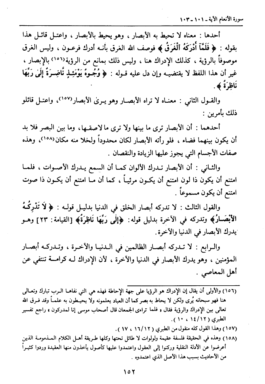 أحدها: معناه لا تحيط به الأبصار , وهو يحيط بالأبصار , واعتل قائل هذا بقوله: {فَلَمَّا أَدْرَكَهُ الْغَرَقُ} فوصف الله الغرق بأنه أدرك فرعون , وليس الغرق موصوفاً بالرؤية , كذلك الإدراك هنا , وليس ذلك بمانع من الرؤية بالإِبصار , غير أن هذا اللفظ لا يقتضيه وإن دل عليه قوله: {وُجُوهٌ يَوْمَئِذٍ نَّاضِرَةٌ إِلَى رَبِّهَا نَاظِرَةٌ}. والقول الثاني: معناه لا تراه الأبصار وهو يرى الأبصار , واعتل قائلو ذلك بأمرين: أحدهما: أن الأبصار ترى ما بينها ولا ترى ما لاصقها , وما بين البصر فلا بد أن يكون بينهما فضاء , فلو رأته الأبصار لكان محدوداً ولخلا منه مكان , وهذه صفات الأجسام التي يجوز عليها الزيادة والنقصان. والثاني: أن الأبصار تدرك الألوان كما أن السمع يدرك الأصوات , فلما امتنع أن يكون ذا لون امتنع أن يكون مرئياً , كما أن ما امتنع أن يكون ذا صوت امتنع أن يكون مسموعاً. والقول الثالث: لا تدركه أبصار الخلق في الدنيا بدليل قوله: {لاَ تَدْرِكُهُ الأَبْصَارُ} وتدركه في الآخرة بدليل قوله: {إلى رَبِّهَا نَاظِرَةٌ} [القيامة: 23] وهو يدرك الأبصار في الدنيا والآخرة. والرابع: لا تدركه أبصار الظالمين في الدنيا والآخرة , وتدركه أبصار المؤمنين , وهو يدرك الأبصار في الدنيا والآخرة , لأن الإِدراك له كرامة تنتفي عن أهل المعاصي.