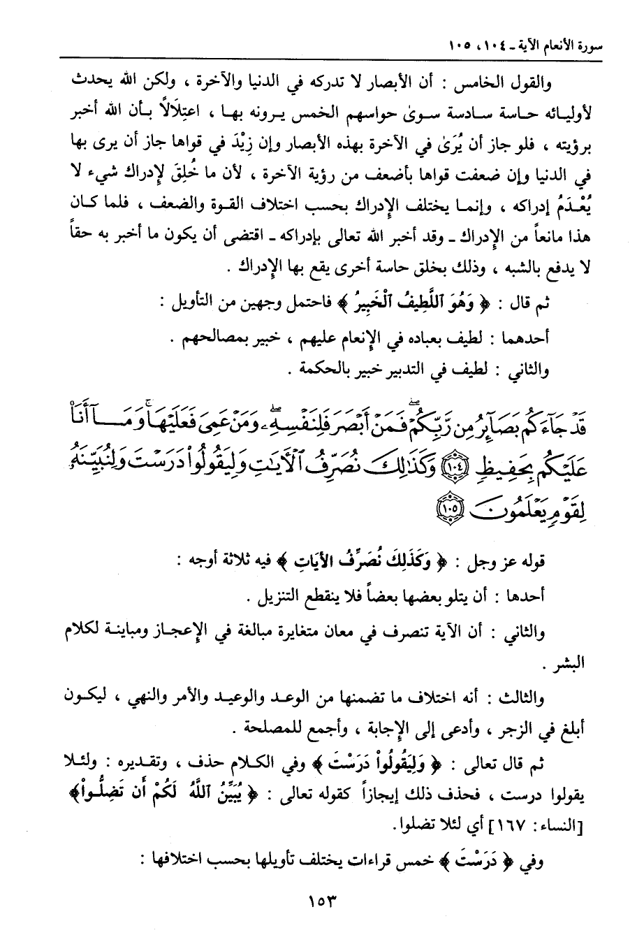 {قد جاءكم بصائر من ربكم فمن أبصر فلنفسه ومن عمي فعليها وما أنا عليكم بحفيظ وكذلك نصرف الآيات وليقولوا درست ولنبينه لقوم يعلمون} قوله عز وجل: {وَكَذَلِكَ نُصَرِّفُ الآيَاتِ} فيه ثلاثة أوجه: أحدها: أن يتلو بعضها بعضاً فلا ينقطع التنزيل. والثاني: أن الآية تنصرف في معان متغايرة مبالغة في الإِعجاز ومباينة لكلام البشر. والثالث: أنه اختلاف ما تضمنها من الوعد والوعيد والأمر والنهي , ليكون أبلغ في الزجر , وأدعى إلى الإِجابة , وأجمع للمصلحة. ثم قال تعالى: {وَلِيَقُولُواْ دَرَسْتَ} وفي الكلام حذف , وتقديره: ولئلا يقولوا درست , فحذف ذلك إيجازاً كقوله تعالى: {يُبَيِّنُ اللَّهُ لَكُمْ أَن تَضِلُّواْ} [النساء: 167] أي لئلا تضلوا. وفي {دَرَسْتَ} خمس قراءات يختلف تأويلها بحسب اختلافها:
