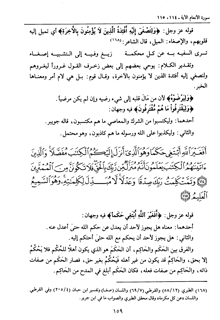 {أفغير الله أبتغي حكما وهو الذي أنزل إليكم الكتاب مفصلا والذين آتيناهم الكتاب يعلمون أنه منزل من ربك بالحق فلا تكونن من الممترين وتمت كلمة ربك صدقا وعدلا لا مبدل لكلماته وهو السميع العليم} قوله عز وجل: {أَفَغَيْرَ اللَّهِ أَبْتَغِي حَكَماً} فيه وجهان: أحدهما: معناه هل يجوز لأحد أن يعدل عن حكم الله حتى أعدل عنه. والثاني: هل يجوز لأحد أن يحكم مع الله حتى أحتكم إليه. والفرق بين الحَكَم والحَاكِم , أن الحَكَمَ هو الذي يكون أهلاً للحُكْم فلا يَحْكُمُ إلا بحق , والحَاكِمُ قد يكون من غير أهله فَيَحْكُمُ بغير حق , فصار الحَكَم من صفات ذاته , والحَاكِم من صفات فعله , فكان الحَكَم أبلغ في المدح من الحَاكِم.