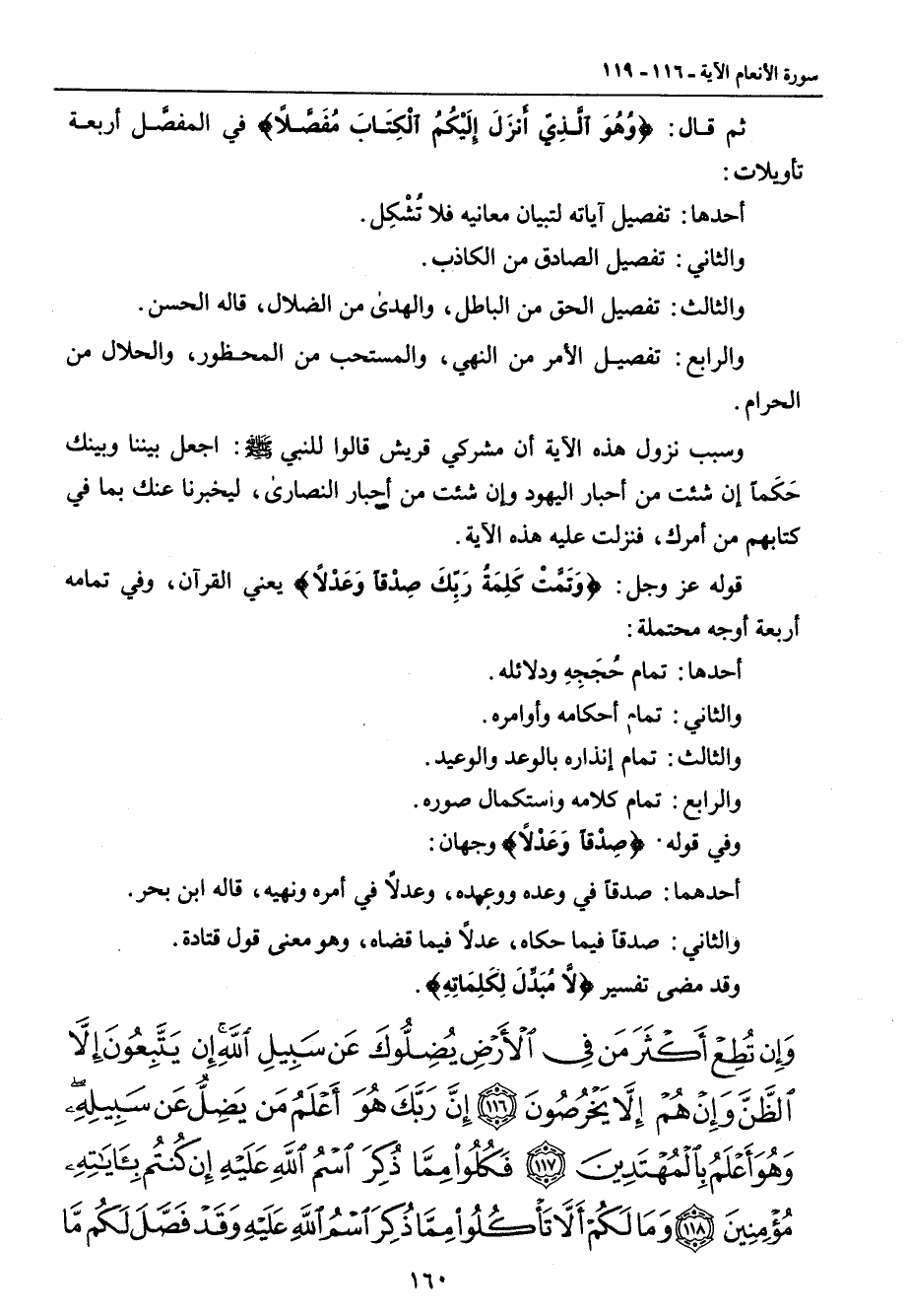 ثم قال: {وُهُوَ الَّذِيِّ أَنزَلَ إِلَيْكُمُ الْكِتَابَ مُفَصَّلاً} في المفصَّل أربعة تأويلات: أحدها: تفصيل آياته لتبيان معانيه فلا تُشْكِل. والثاني: تفصيل الصادق من الكاذب. والثالث: تفصيل الحق من الباطل , والهدى من الضلال , قاله الحسن. والرابع: تفصيل الأمر من النهي , والمستحب من المحظور , والحلال من الحرام. وسبب نزول هذه الآية أن مشركي قريش قالوا للنبي صلى الله عليه وسلم: اجعل بيننا وبينك حَكَماً إن شئت من أحبار اليهود وإن شئت من أحبار النصارى , ليخبرنا عنك بما في كتابهم من أمرك , فنزلت عليه هذه الآية. قوله عز وجل: {وَتَمَّتَ كَلِمَةُ رَبِّكَ صِدْقاً وَعَدْلاً} يعني القرآن , وفي تمامه أربعة أوجه محتملة: أحدها: تمام حُجَجِهِ ودلائله. والثاني: تمام أحكامه وأوامره. والثالث: تمام إنذاره بالوعد والوعيد. والرابع: تمام كلامه واستكمال صوره. وفي قوله: {صِدْقاً وَعَدْلاً} وجهان: أحدهما: صدقاً في وعده ووعهده , وعدلاً في أمره ونهيه , قاله ابن بحر. والثاني: صدقاً فيما حكاه , عدلاً فيما قضاه , وهو معنى قول قتادة. وقد مضى تفسير {لاَّ مُبَدِّلَ لِكَلِمَاتِهِ}.