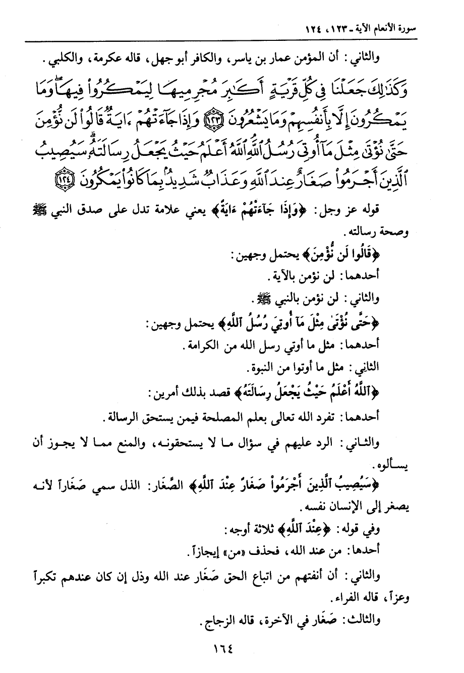 {وكذلك جعلنا في كل قرية أكابر مجرميها ليمكروا فيها وما يمكرون إلا بأنفسهم وما يشعرون وإذا جاءتهم آية قالوا لن نؤمن حتى نؤتى مثل ما أوتي رسل الله الله أعلم حيث يجعل رسالته سيصيب الذين أجرموا صغار عند الله وعذاب شديد بما كانوا يمكرون} قوله عز وجل: {وَإِذَا جَآءَتْهُمْءَايَةٌ} يعني علامة تدل على صدق النبي صلى الله عليه وسلم وصحة رسالته. {قَالُوا لَن نُّؤْمِنَ} يحتمل وجهين: أحدهما: لن نؤمن بالآية. والثاني: لن نؤمن بالنبي صلى الله عليه وسلم. {حَتَّى نُؤْتَى مِثْلَ مَآ أُوتِيَ رُسُلُ اللَّهِ} يحتمل وجهين: أحدهما: مثل ما أوتي رسل الله من الكرامة. الثاني: مثل ما أوتوا من النبوة. {اللَّهُ أَعْلَمُ حَيْثُ يَجْعَلُ رِسَالَتَهُ} قصد بذلك أمرين: أحدهما: تفرد الله تعالى بعلم المصلحة فيمن يستحق الرسالة. والثاني: الرد عليهم في سؤال ما لا يستحقونه , والمنع مما لا يجوز أن يسألوه. {سَيُصِيبُ الَّذِينَ أَجرَمُواْ صَغَارٌ عِنْدَ اللَّهِ} الصَّغَار: الذل سمي صَغَاراً لأنه يصغر إلى الإنسان نفسه. وفي قوله: {عِنْدَ اللَّهِ} ثلاثة أوجه: أحدها: من عند الله , فحذف (من) إيجازاً. والثاني: أن أنفتهم من اتباع الحق صَغَار عند الله وذل إن كان عندهم تكبراً وعزاً , قاله الفراء. والثالث: صَغَار في الآخرة , قاله الزجاج.