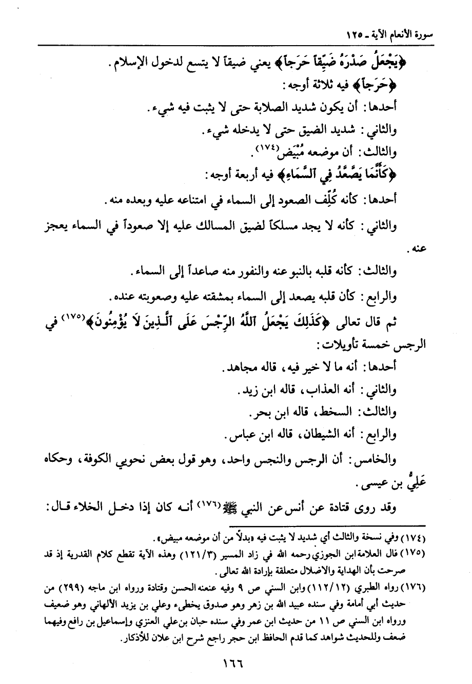 والثاني: يهديه إلى الدلائل المؤدية إلى الحق. {يَشْرَحْ صدْرَهُ لِلإِسْلاَمِ} يعني بشرح الصدر سعته لدخول الأسلام إيه وثبوته فيه كقوله تعالى: {أَلَمْ نَشَرْحْ لَكَ صَدْرَك} [الشرح: 1]. روى عمرو بن مرة عن أبي جعفر قال: سئل رسول الله صلى الله عليه وسلم أي المؤمنين أكْيَس؟ قال: (أَكْثَرُهُم ذِكْراً لِلْمَوتِ وَأَحْسَنُهُمْ لِمَا بَعْدَهُ اسْتِعْدَاداً) قال: وسئل النبي صلى الله عليه وسلم عن هذه الآية: قالوا: كيف يشرح صدره يا رسول الله؟ قال: (نُوْرٌ يُقْذَفُ فَيَنْشَرِحُ لَهُ وَيَنفَسِحُ) قالوا: فهل لذلك أمارة يُعْرَفُ بها؟ قال: (الإِنَابَةُ إِلَى دَارِ الخُلُودِ وَالتَّجَافِي عَنْ دَارِ الغُرورِ وَالاسْتِعْدَادِ لِلْمَوتِ قَبْلَ لِقَاءِ المَوتِ) وروى ابن مسعود مثل ذلك. ثم قال: {وَمَن يُرِدْ أَن يُضِلَّهُ} فيه قولان: أحدهما: يضله عن الهداية إلى الحق. والثاني: عن نيل الثواب واستحقاق الكرامة. {يَجْعَلُ صَدْرَهُ ضَيِّقاً حَرَجاً} يعني ضيقاً لا يتسع لدخول الإسلام. {حَرَجاً} فيه ثلاثة أوجه: أحدها: أن يكون شديد الصلابة حتى لا يثبت فيه شيء. والثاني: شديد الضيق حتى لا يدخله شيء. والثالث: أن موضعه مُبْيَض. {كَأَنَّمَا يَصَّعَّدُ فِي السَّمَآءِ} فيه أربعة أوجه: أحدها: كأنه كُلِّف الصعود إلى السماء في امتناعه عليه وبعده منه. والثاني: كأنه لا يجد مسلكاً لضيق المسالك عليه إلا صعوداً في السماء يعجز عنه. والثالث: كأنه قلبه بالنبو عنه والنفور منه صاعداً إلى السماء. والرابع: كأن قلبه يصعد إلى السماء بمشقته عليه وصعوبته عنده. ثم قال تعالى: {كَذَلِكَ يَجْعَلُ اللَّهُ الرِّجْسَ عَلَى الَّذِينَ لاَ يُؤْمِنُونَ} في الرجس خمسة تأويلات: أحدها: أنه ما لا خير فيه , قاله مجاهد. والثاني: أنه العذاب , قاله ابن زيد. والثالث: السخط , قاله ابن بحر. والرابع: انه الشيطان , قاله ابن عباس. والخامس: أن الرجس والنجس واحد , وهو قول بعض نحويي الكوفة , وحكاه عَلِيُّ بن عيسى. وقد روى قتادة عن أنس عن النبي صلى الله عليه وسلم أنه كان إذا دخل الخلاء قال: