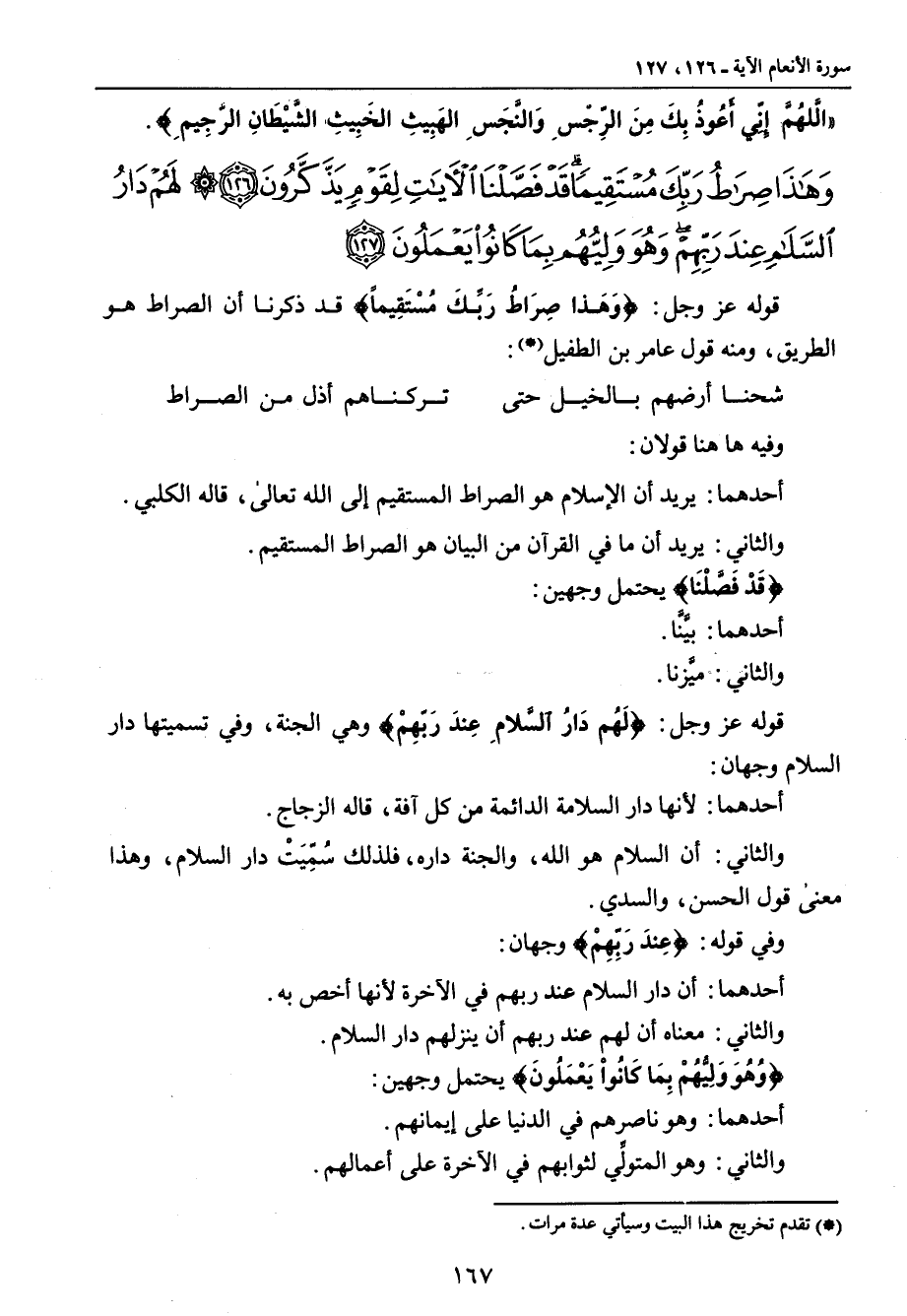 {وهذا صراط ربك مستقيما قد فصلنا الآيات لقوم يذكرون لهم دار السلام عند ربهم وهو وليهم بما كانوا يعملون} قوله عز وجل: {وَهَذا صِرَاطُ رَبِّكَ مُسْتَقِيماً} قد ذكرنا أن الصراط هو الطريق , ومنه قول عامر ابن الطفيل: