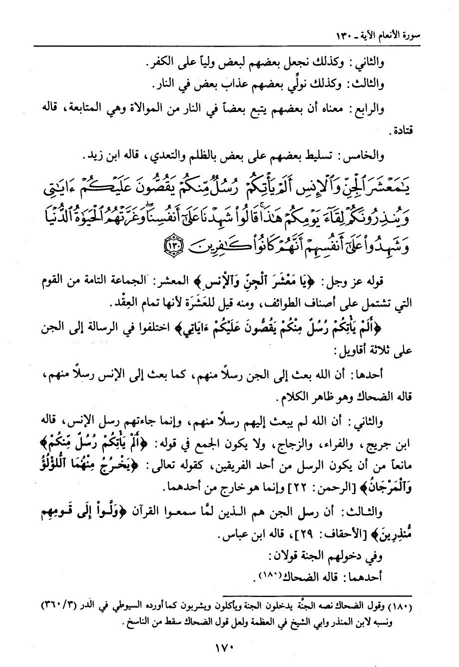 {يا معشر الجن والإنس ألم يأتكم رسل منكم يقصون عليكم آياتي وينذرونكم لقاء يومكم هذا قالوا شهدنا على أنفسنا وغرتهم الحياة الدنيا وشهدوا على أنفسهم أنهم كانوا كافرين} قوله عز وجل: {يَا مَعشَرَ الْجِنِّ وَالإِنْسِ} المعشر: الجماعة التامة من القوم التي تشتمل على أصناف الطوائف , ومنه قيل للعَشَرَة لأنها تمام العِقْد. {أَلَمْ يَأْتِكُمْ رُسُلُ مِنْكُمْ يَقُصُّون عَلَيْكُمْءَايَاتِي} اختلفوا في الرسالة إلى الجن على ثلاثة أقاويل. أحدها: ان الله بعث إلى الجن رسلاً منهم , كما بعث إلى الإنس رسلاً منهم , قاله الضحاك وهو ظاهر الكلام. والثاني: أن الله لم يبعث إليهم رسلاً منهم , وإنما جاءتهم رسل الإنس , قاله ابن جريج , والفراء , والزجاج , ولا يكون الجمع في قوله: {أَلَمْ يَأْتِكُمْ رُسُلٌ مِّنُكُمْ} مانعاً من أن يكون الرسل من أحد الفريقين , كقوله تعالى: {يَخْرُجُ مِنْهُمَا الُّلؤْلُؤُ وَالْمَرْجَانُ} [الرحمن: 22] وإنما هو خارج من أحدهما. والثالث: أن رسل الجن هم الذين لمَّا سمعوا القرآن {وَلَّواْ إِلَى قَومِهِم مُّنذِرِينَ} [الأحقاف: 29] , قاله ابن عباس. وفي دخولهم الجنة قولان: أحدهما: قاله الضحاك.