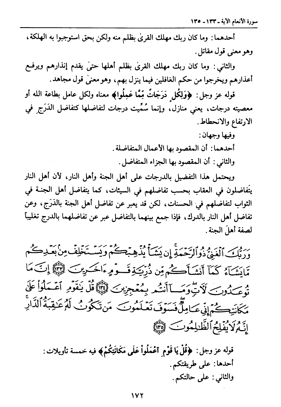 {ذلك أن لم يكن ربك مهلك القرى بظلم وأهلها غافلون ولكل درجات مما عملوا وما ربك بغافل عما يعملون} قوله تعالى: {ذَلِكَ أَن لَّمْ يَكُنْ رَّبُّكَ مُهْلِكَ الْقُرَى بِظُلْمٍ وَأَهْلُهَا غَافِلُونَ} فيه وجهان: أحدهما: وما كان ربك مهلك القرى بظلم منه ولكن بحق استوجبوا به الهلكة , وهو معنى قول مقاتل. والثاني: وما كان ربك مهلك القرى بظلم أهلها حتى يقدم إنذارهم ويرفع أعذارهم ويخرجوا من حكم الغافلين فيما ينزل بهم , وهو معنى قول مجاهد. قوله عز وجل: {وَلِكُلٍ دَرَجَاتٌ مِّمَّا عَمِلُوا} معناه ولكل عامل بطاعة الله أو معصيته درجات , يعني منازل , وإنما سُمِّيت درجات لتفاضلها كتفاضل الدَرَجِ في الارتفاع والانحطاط. وفيها وجهان: أحدهما: أن المقصود بها الأعمال المتفاضلة. والثاني: أن المقصور بها الجزاء المتفاضل. ويحتمل هذا التفضيل بالدرجات على أهل الجنة , وأهل النار , لأن أهل النار يَتفاضلون في العقاب بحسب تفاضلهم في السيئات , كما يتفاضل أهل الجنة في الثواب لتفاضلهم في الحسنات , لكن قد يعبر عن تفاضل أهل الجنة بالدَرَج , وعن تفاضل أهل النار بالدرك , فإذا جمع بينهما بالتفاضل عبر عن تفاضلهما بالدرج تغليباً لصفة أهل الجنة.
