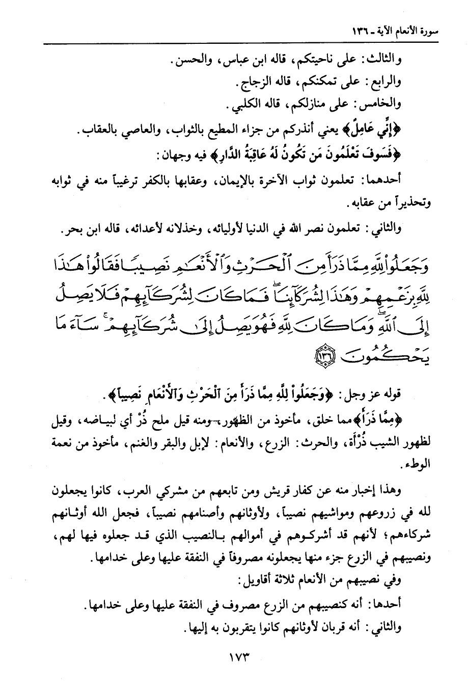 {وجعلوا لله مما ذرأ من الحرث والأنعام نصيبا فقالوا هذا لله بزعمهم وهذا لشركائنا فما كان لشركائهم فلا يصل إلى الله وما كان لله فهو يصل إلى شركائهم ساء ما يحكمون} قوله عز وجل: {وَجَعَلُواْ لِلَّهِ مِمَّا ذَرَأَ مِنَ الْحَرْثِ وَالأَنْعَامِ نَصِيباً}. . {مِمَّا ذَرَأَ} مما خلق , مأخوذ من الظهور , ومنه قيل ملح ذُرْ أي لبياضه , وقيل لظهور الشيب ذُرْأَة , والحرث: الزرع , والأنعام: الإبل والبقر والغنم , مأخوذ من نعمة الوطء. وهذا إخبار منه عن كفار قريش ومن تابعهم من مشركي العرب , كانوا يجعلون لله في زروعهم ومواشيهم نصيباً , ولأوثانهم وأصنامهم نصيباً , فجعل الله أوثانهم شركاءهم؛ لأنهم قد أشركوهم في أموالهم بالنصيب الذي قد جعلوه فيها لهم , ونصيبهم في الزرع جزء منها يجعلونه مصروفاً في النفقة عليها وعلى خدامها. وفي نصيبهم من الأنعام ثلاثة أقاويل: أحدها: أنه كنصيبهم من الزرع مصروف في النفقة عليها وعلى خدامها. والثاني: أنه قربان لأوثانهم كانوا يتقربون به إليها.