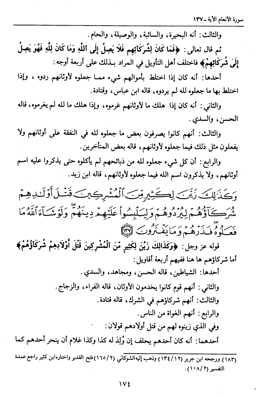{وكذلك زين لكثير من المشركين قتل أولادهم شركاؤهم ليردوهم وليلبسوا عليهم دينهم ولو شاء الله ما فعلوه فذرهم وما يفترون} قوله عز وجل: {وَكَذَلِكَ زَيَّنَ لِكَثِيرٍ مِّنَ الْمُشْرِكِينَ قَتْلَ أَوْلاَدِهِمْ شُرَكَآؤُهُمْ} أما شركاؤهم ها هنا ففيهم أربعة أقاويل: أحدها: الشياطين , قاله الحسن , ومجاهد , والسدي. والثاني: أنهم قوم كانوا يخدمون الأوثان , قاله الفراء , والزجاج. والثالث: أنهم الغواة من الناس. وفي الذي زينوه لهم من قتل أولادهم قولان: أحدهما: أنه كان أحدهم يحلف إن وُلِدَ له كذا وكذا غلام ان ينحر أحدهم كما