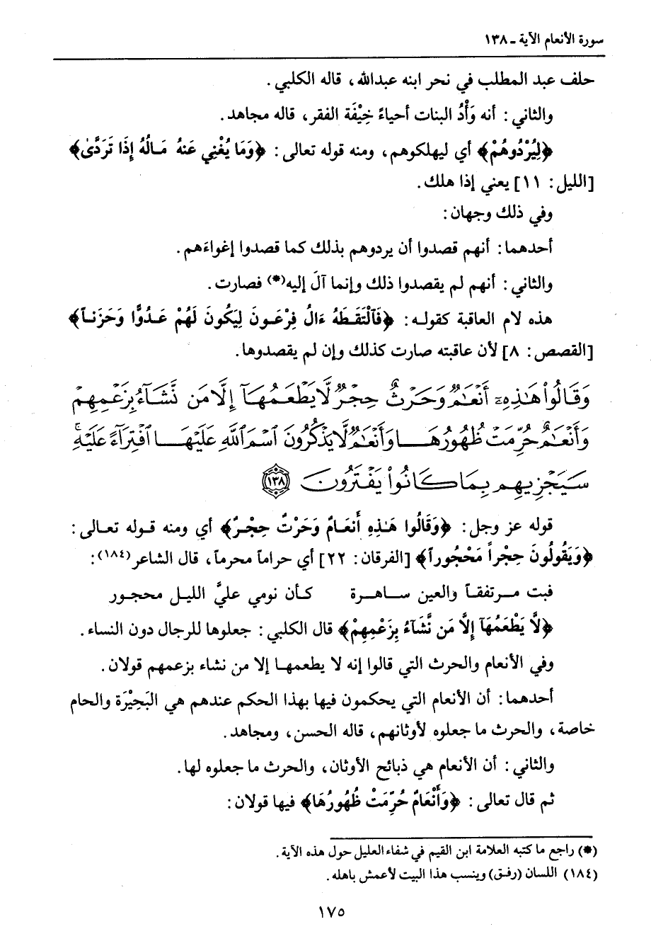 {وقالوا هذه أنعام وحرث حجر لا يطعمها إلا من نشاء بزعمهم وأنعام حرمت ظهورها وأنعام لا يذكرون اسم الله عليها افتراء عليه سيجزيهم بما كانوا يفترون} قوله عز وجل: {وَقَالُوا هَذِهِ أَنعَامٌ وَحَرْثٌ حِجْرٌ} أي ومنه قوله تعالى: {وَيَقُولُونَ حِجْراً مَحْجُوراً} [الفرقان: 22] أي حراماً , قال الشاعر: