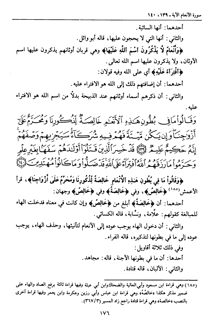 {وقالوا ما في بطون هذه الأنعام خالصة لذكورنا ومحرم على أزواجنا وإن يكن ميتة فهم فيه شركاء سيجزيهم وصفهم إنه حكيم عليم قد خسر الذين قتلوا أولادهم سفها بغير علم وحرموا ما رزقهم الله افتراء على الله قد ضلوا وما كانوا مهتدين} {وَقَالُواْ مَا فِي بُطُونِ هَذِهِ الأَنْعَامِ خَالِصَةٌ لِّذُكُورِنَا وَمُحَرَّمٌ عَلَى أَزْوَاجِنَا} , قرأ الأعمش {خَالِصٌ} , وفي {خَالِصَةٌ} وفي {خَالِصٌ} وجهان: أحدهما: أن {خَالِصَةٌ} أبلغ من {خَالِصٌ} وإن كانت في معناه فدخلت الهاء للمبالغة كقولهم: علاَّمة , ونسَّابة , قاله الكسائي. والثاني: أن دخول الهاء يوجب عوده إلى الأنعام لتأنيثها , وحذف الهاء , يوجب عوده إلى ما في بطونها لتذكيره , قاله الفراء. وفي ذلك ثلاثة أقاويل: أحدها: أن ما في بطونها الأجنة , قاله: مجاهد. والثاني: الألبان , قاله قتادة.