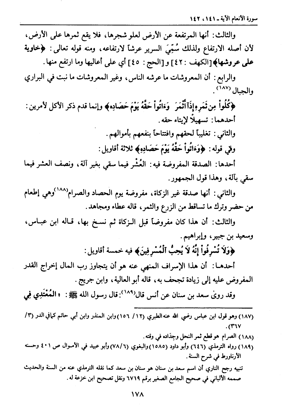 والثالث: أنها المرتفعة عن الأرض لعلو شجرها , فلا يقع ثمرها على الأرض , لأن أصله الارتفاع ولذلك سُمِّيَ السرير عرشاً لارتفاعه , ومنه قوله تعالى: {خاوية على عروشها} [الكهف: 42] و [الحج: 45] أي على أعاليها وما ارتفع منها. والرابع: أن المعروشات ما عرشه الناس , وغير المعروشات ما نبت في البراري والجبال. {كُلُواْ مِن ثَمَرِهِ إِذَا أَثْمَرَ وَءَاتُواْ حَقَّهُ يَوْمَ حَصَادِهِ} وإنما قدم ذكر الأكل لأمرين: أحدهما: تسهيلاً لإيتاء حقه. والثاني: تغليباً لحقهم وافتتاحاً بنفعهم بأموالهم. وفي قوله: {وَءَاتُواْ حَقَّهُ يَوْمَ حَصَادِهِ} ثلاثة أقاويل: أحدها: الصدقة المفروضة فيه: العُشْر فيما سقي بغير آلة , ونصف العشر فيما سقي بآلة , وهذا قول الجمهور. والثاني: أنها صدقة غير الزكاة , مفروضة يوم الحصاد والصرام وهي إطعام من حضر وترك ما تساقط من الزرع والثمر , قاله عطاء ومجاهد. والثالث: أن هذا كان مفروضاً قبل الزكاة ثم نسخ بها , قاله ابن عباس , وسعيد بن جبير , وإبراهيم. {وَلاَ تُسْرِفُواْ إِنَّهُ لاَ يُحِبُّ الْمُسْرِفِينَ} فيه خمسة أقاويل: أحدها: أن هذا الإسراف المنهي عنه هو أن يتجاوز رب المال إخراج القدر المفروض عليه إلى زيادة تجحف به , قاله أبو العالية , وابن جريج. وقد روى سعد بن سنان عن أنس قال: قال رسول الله صلى الله عليه وسلم: (المُعْتَدِي فِي